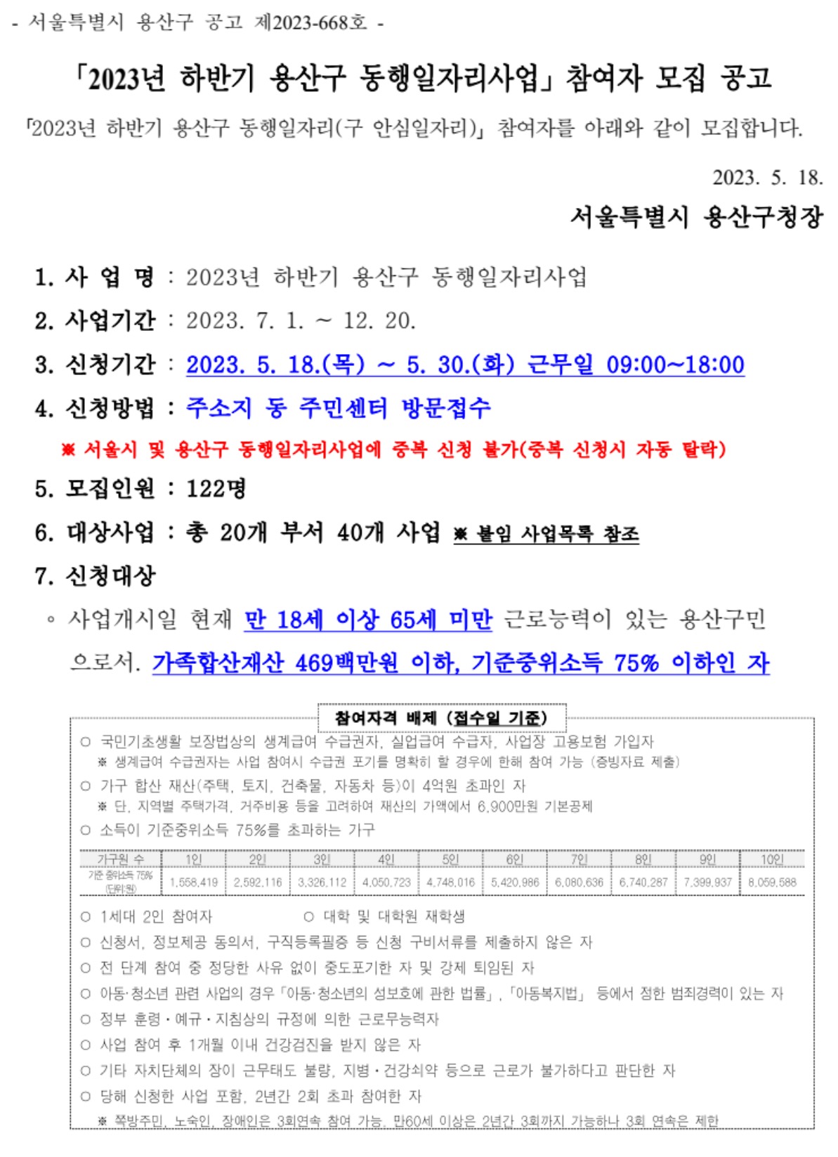 2023년 용산구 동행일자리 지원 신청자격은 만 18세 이상 65세 미만 근로능력이 있는 용산구민으로 가족 합산 재산 4억 6900만 원 또는 기준중위소득 75% 초과자, 1세대 2인 참여자 등은 제외됩니다.