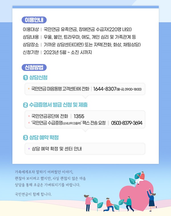 지난 5월 9일부터 국민연금공단은 국민연금 유족연금 및 장애연금 수급자 220명에게 무료로 전문 심리상담을 지원하는 "국민연금 마음동행"사업을 추진한다고 밝혔습니다.