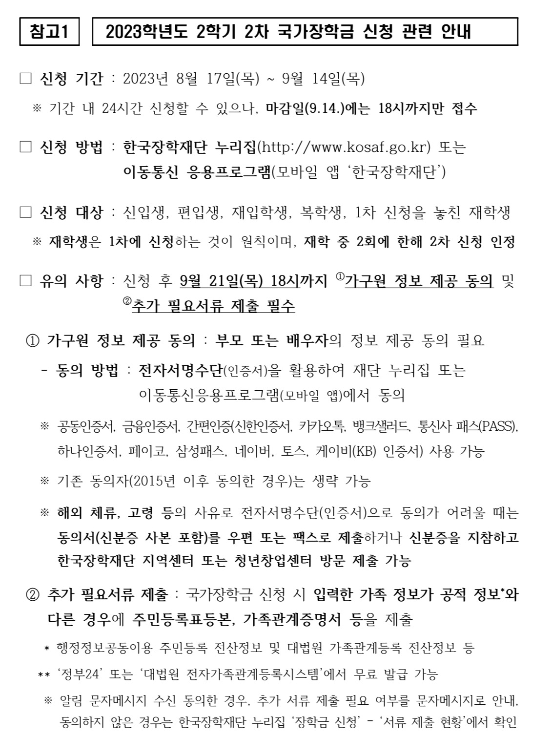 이번 2차 신청 기간에는 신입생, 편입생, 재입학생, 복학생 및 1차 신청을 놓친 재학생이 국가장학금을 신청할 수 있고 2023년 2차 신청 마감 후에는 더 이상 2학기 국가장학금 신청이 불가하니 반드시 기간 내에 신청해야 합니다.