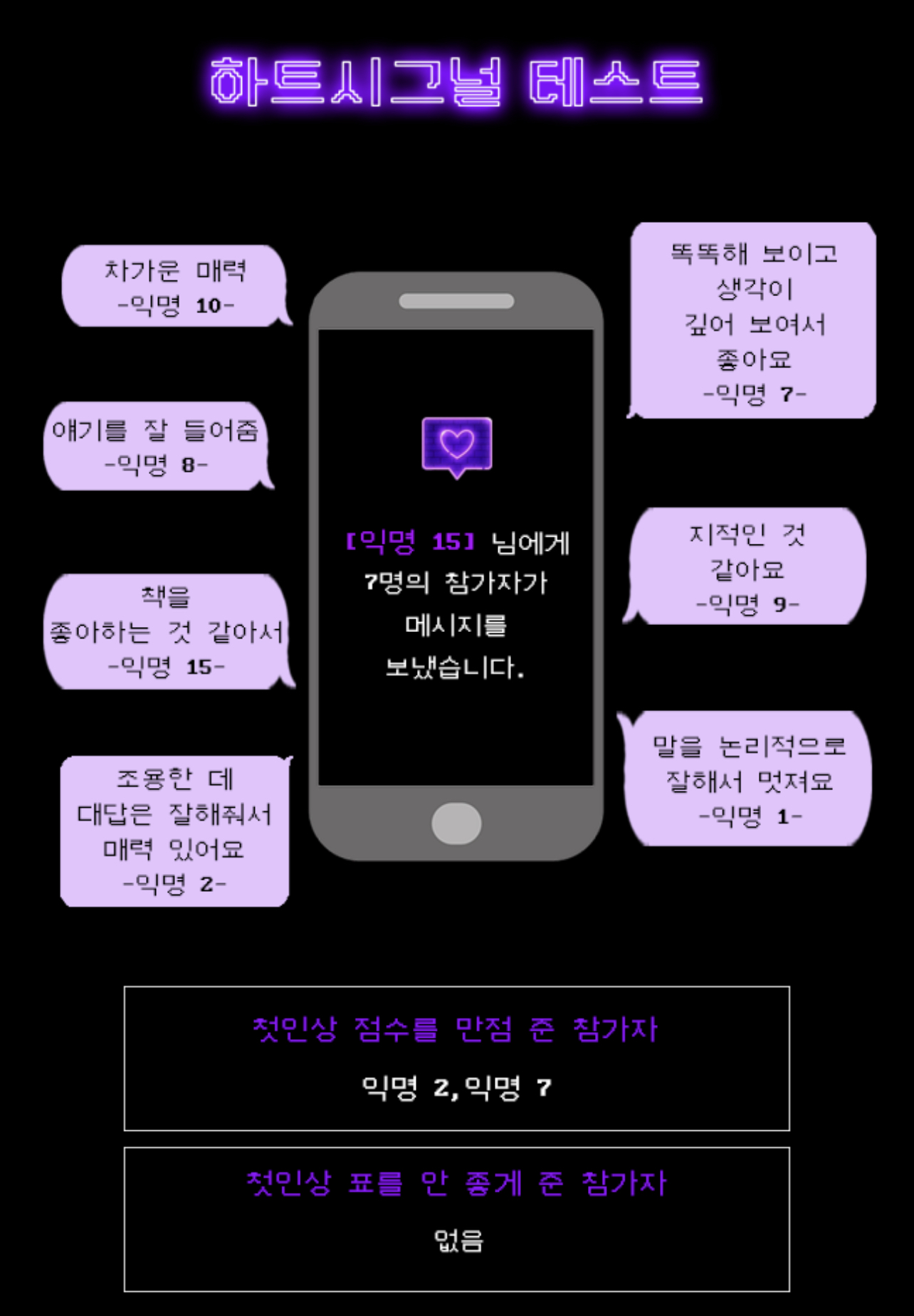 하트시그널 테스트를 다 하시면 사진과 같이 다른 익명들이 보낸 메시지를 보실 수 있습니다.