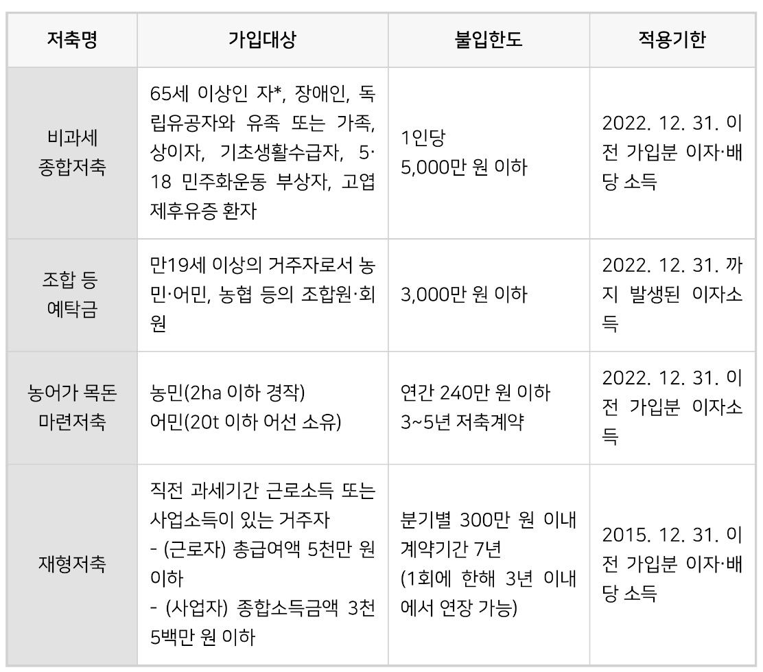 세금을 아예 안 내고 저축상품을 가입할 수 있으면 정말 꿀 같은 정보 일 수 있지만 단점은 가입대상이 까다로워서 활용하기 매우 어렵다는 점입니다