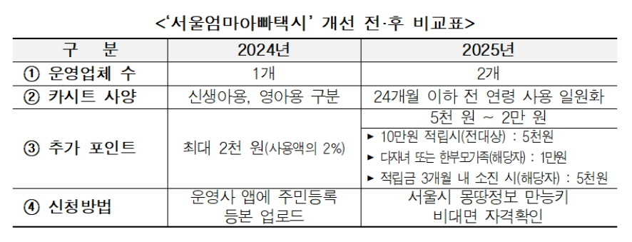 <‘서울엄마아빠택시’ 개선 전·후 비교표>