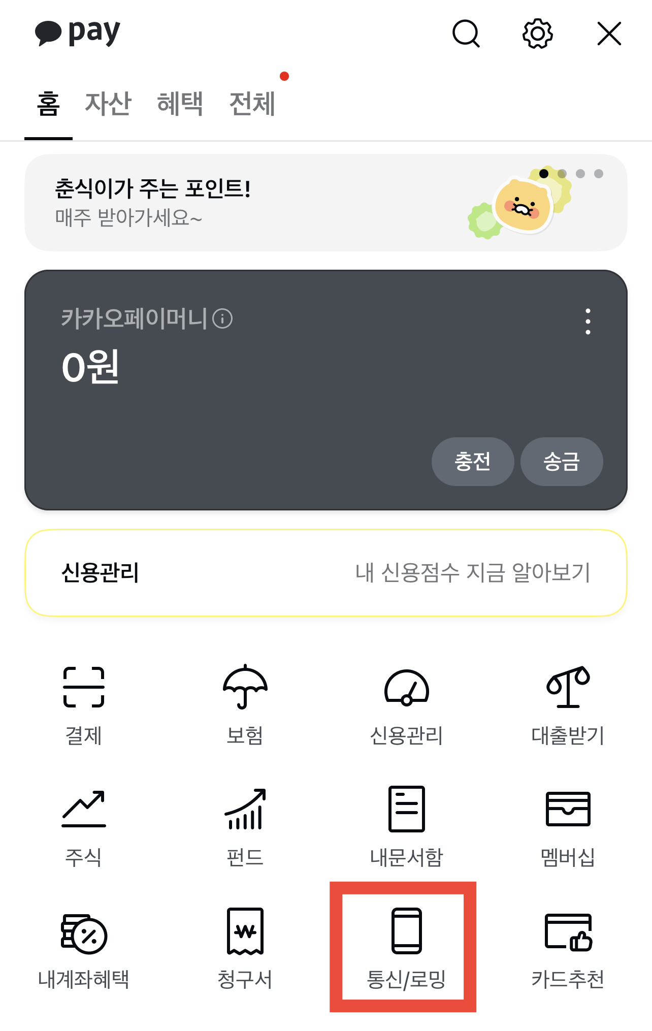 카카오톡 사용자라면 통신/로밍 메뉴를 통해 요금제, 데이터 로밍, 리뉴드 디바이스 등을 둘러보고 구매할 수도 있습니다.