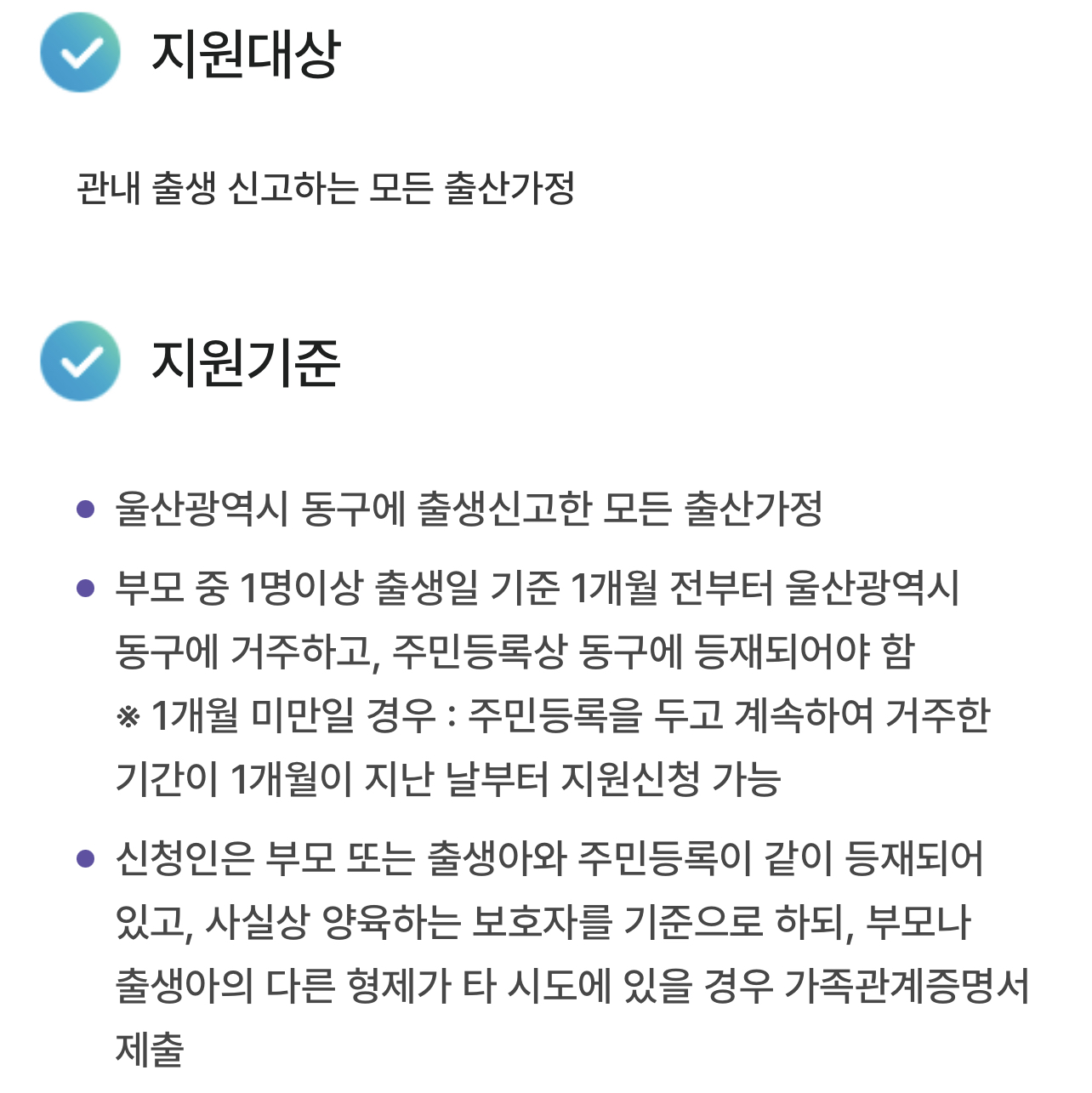 • 부모 중 1명이상 출생일 기준 1개월 전부터 울산광역시 동구에 거주하고, 주민등록상 동구에 등재되어야 함
