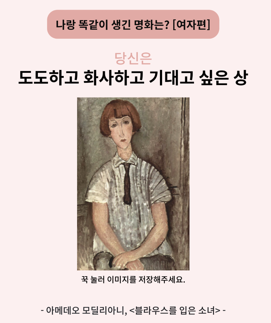과연 여자인 나는 어떤 명화로 그려진다면 어떤 명화일까 알아보는 명화 테스트(여자편)이 있어서 소개드리려 합니다.