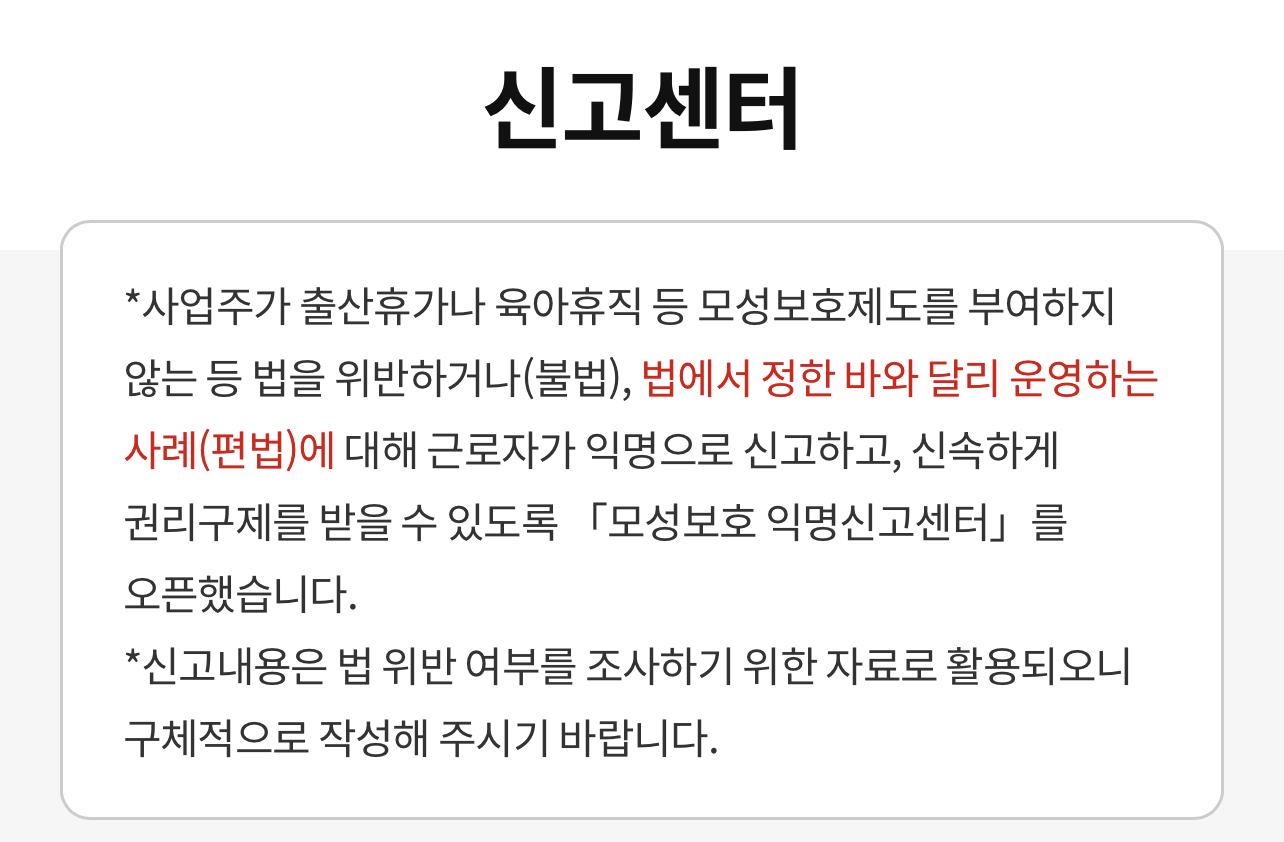 고용노동부 노동포털에서는 사업주가 출산휴가나 육아휴직 등 모성보호제도를 부여하지 않거나 법을 위반하거나(불법) 법에서 정한 바와 달리 운영하는 사례(편법)에 대해 근로자가 익명으로 신고하고 신속하게 권리구제를 받을 수 있도록 모성보호 익명신고센터를 오픈했습니다.
