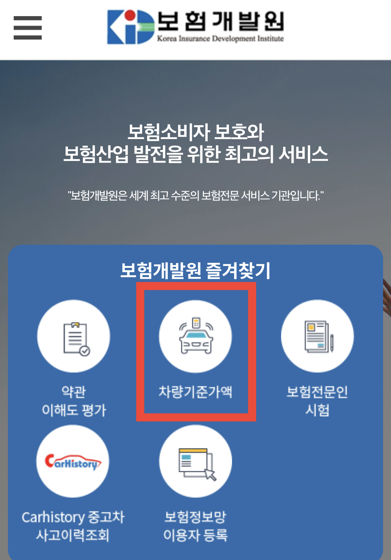 보험개발원 홈페이지를 접속 후 메인화면에 “차량기준가액”을 눌러주시면 됩니다.