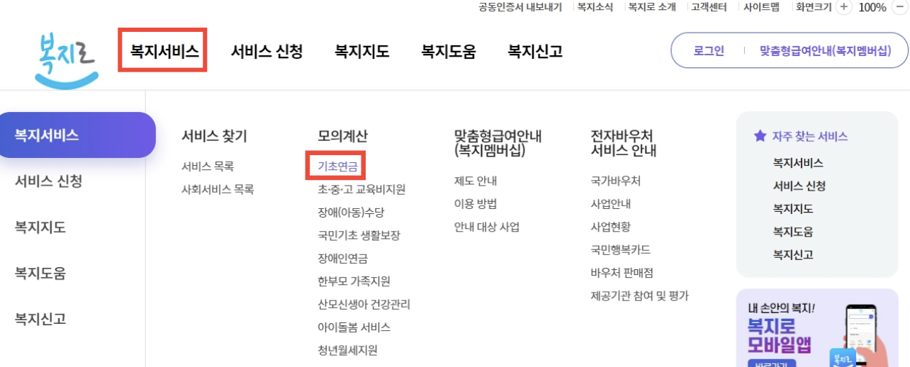 복지로 홈페이지를 접속 하시고 복지서비스을 들어가시고 모의계산에 “기초연금을 눌러주시길 바랍니다.