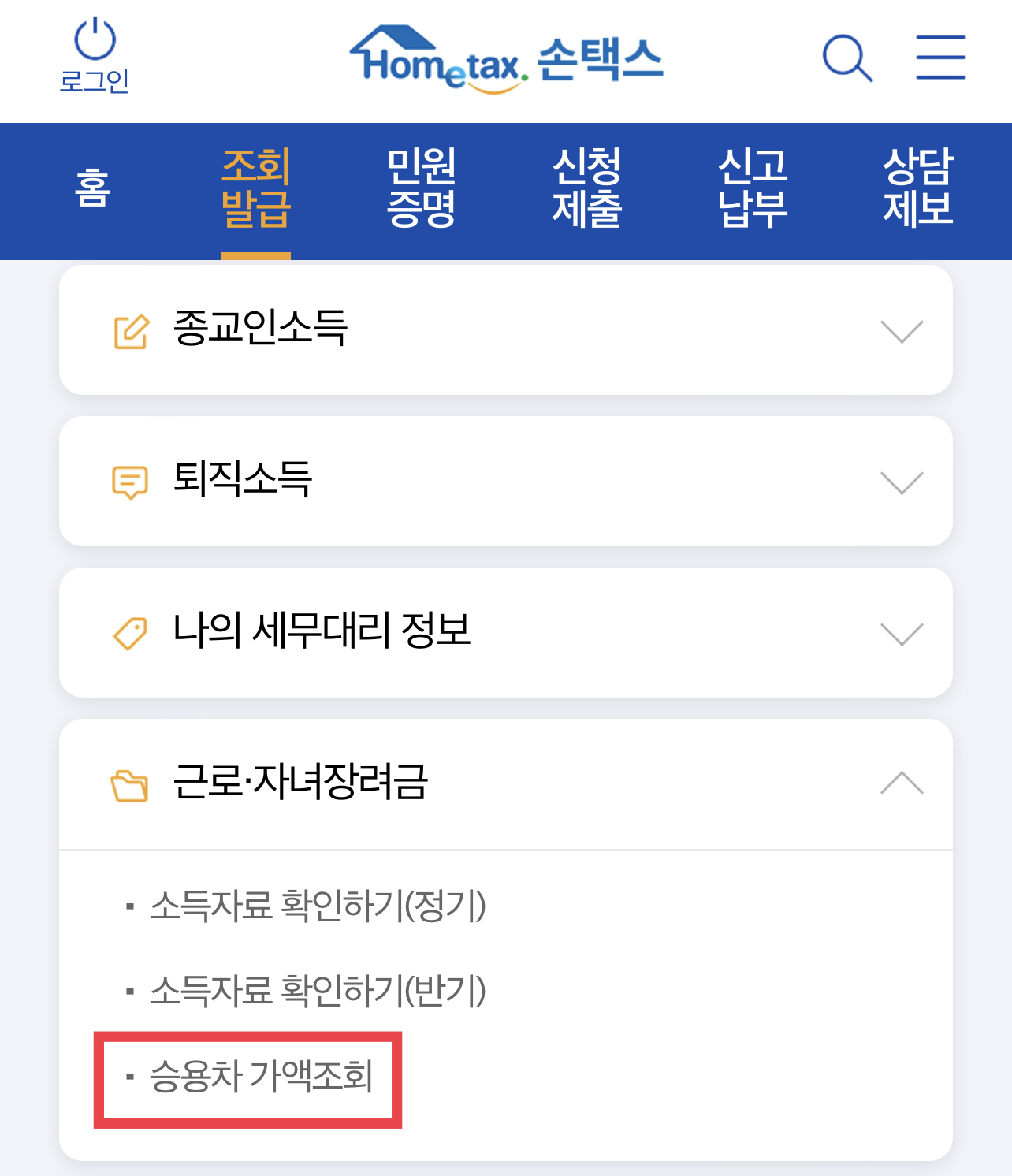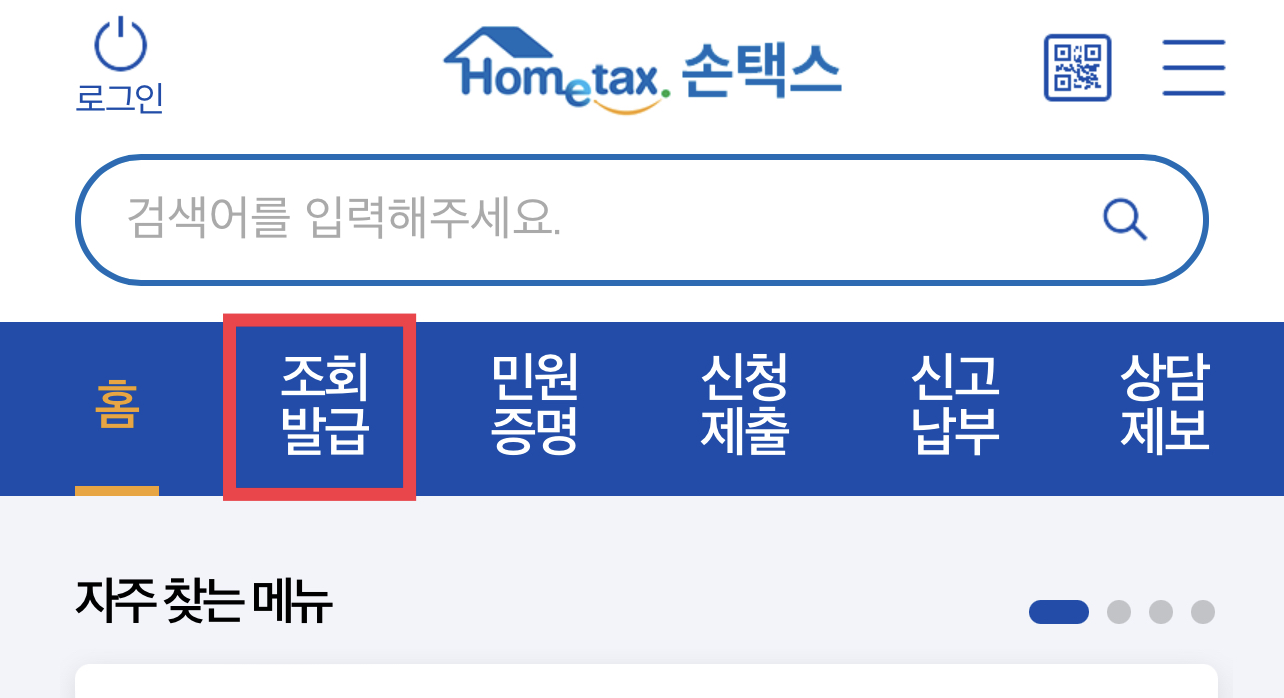 먼저 홈택스 또는 모바일은 손택스로 접속해주시고 메인화면에 보이는 “조회 발급”메뉴를 클릭해주시길 바랍니다.