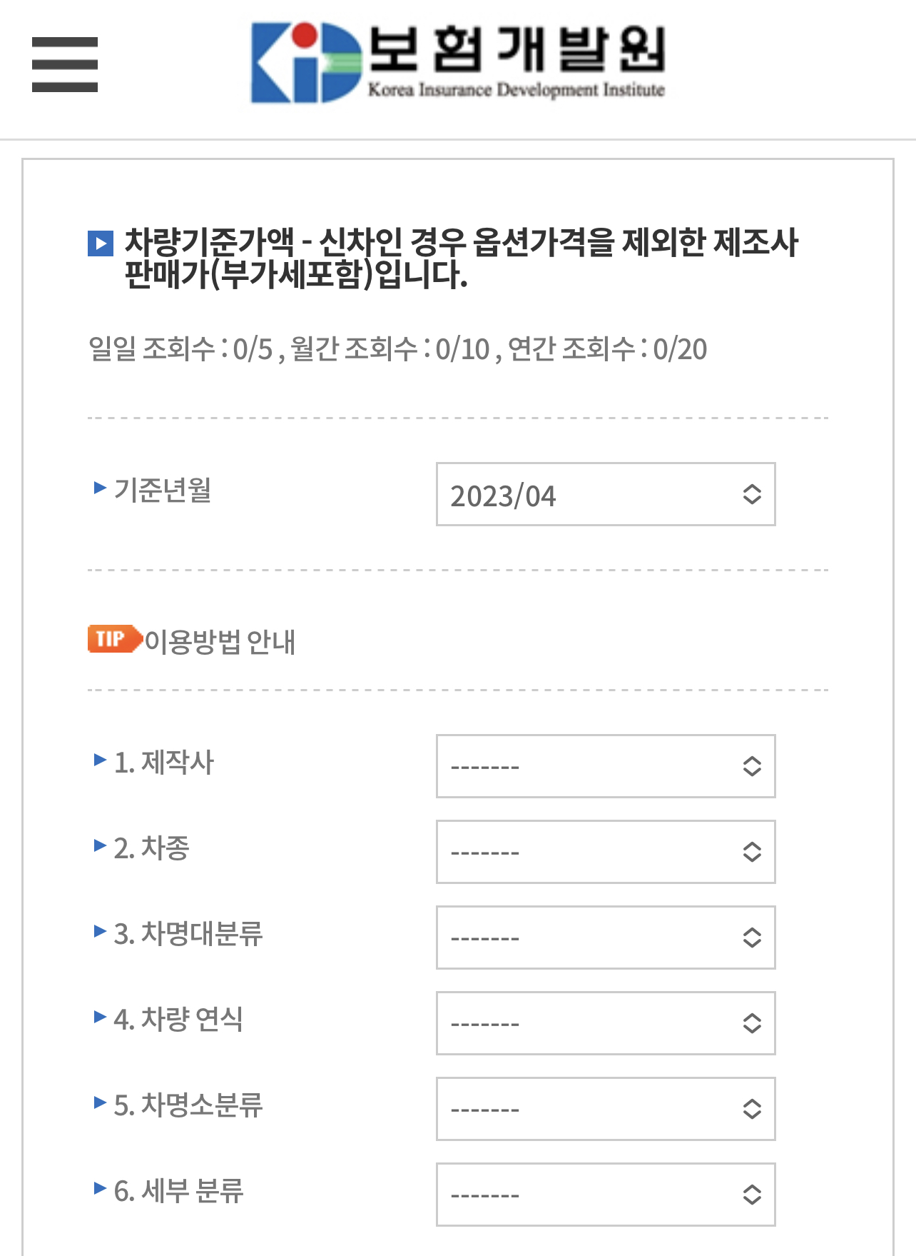 기준년월일 먼저 입력해주시고 제작사, 차종, 차명대분류, 차량 연식, 차명소분류, 세부 분류을 입력하시면 됩니다.