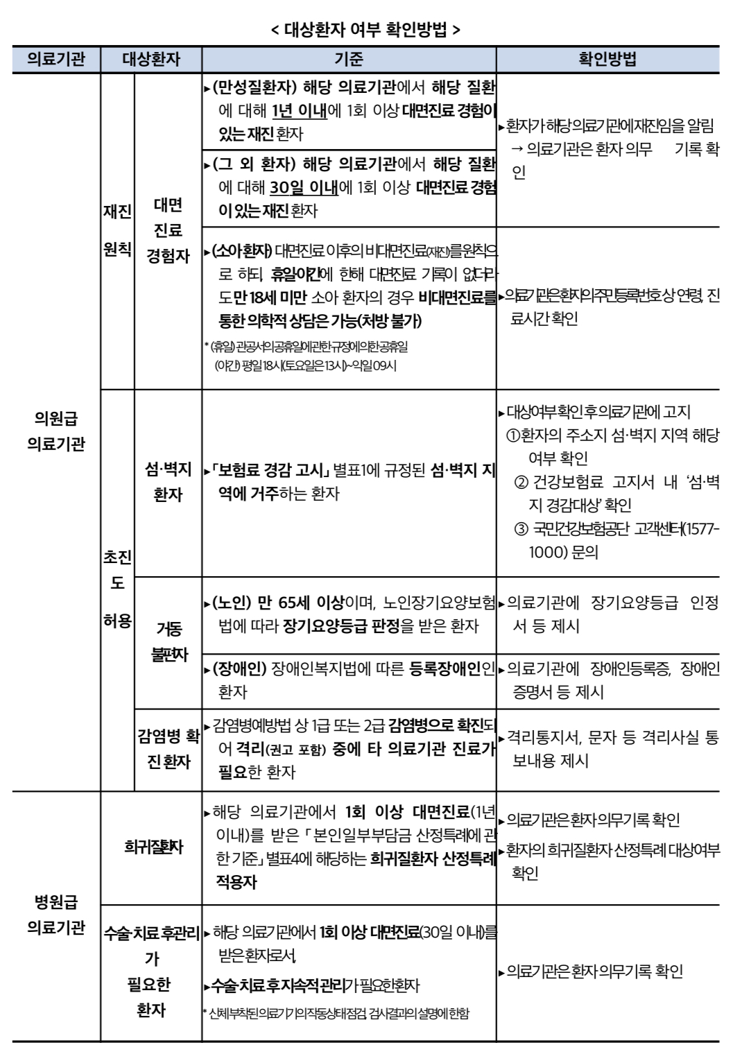 병원급 의료기관에서는 해당 의료기관에서 대면진료 경험이 있는 재진 환자 중, 병원급 진료가 불가피한 희귀질환자(1년 이내), 수술·치료 후 지속적 관리*(30일 이내)가 필요한 환자에 한해 예외적으로 비대면진료를 실시할 수 있습니다.