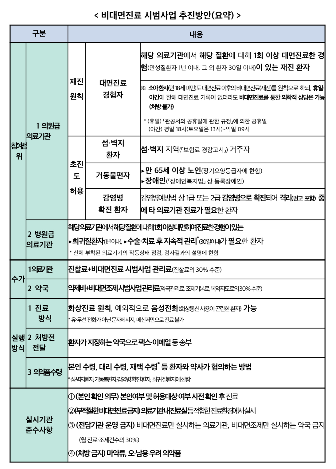 비대면진료는 대면진료의 보완적 진료방법이므로 시범사업에서는 대면진료 경험이 있는 환자를 중심으로 허용하여 안전성을 확보하되, 의료약자에 대해서는 예외적으로 일부 초진을 허용하였습니다.