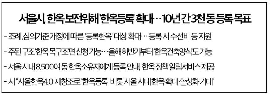 서울시가 「서울한옥4.0 재창조 계획」을 발표한 이후 한옥 보전 및 확대를 위해 '한옥등록' 활성화에 나선다고 합니다.