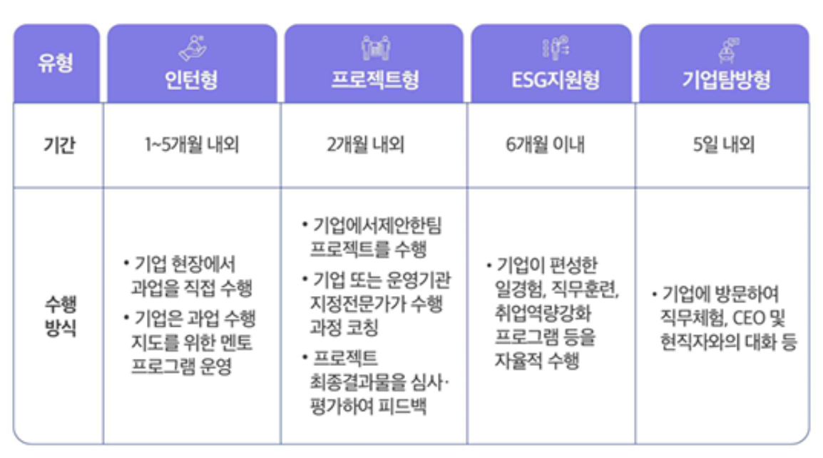 기업에서 직접 과업 또는 현업을 수행하면서 현직자 멘토링을 받고, 직무역량을 강화할 수 있도록 지원하는 일경험 프로그램 (1~5개월 내외)