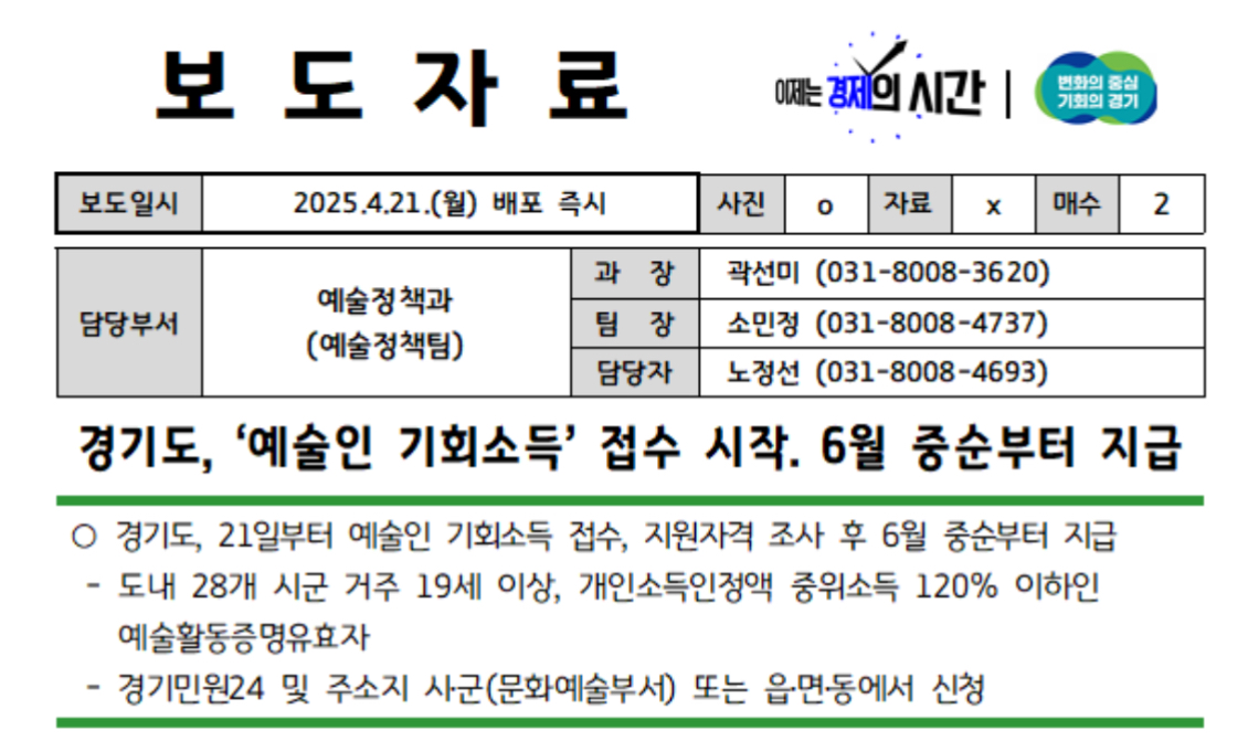 경기도가 2025년 4월 21일부터 ‘2025년 경기도 예술인 기회소득’ 접수를 시작한다고 합니다.
