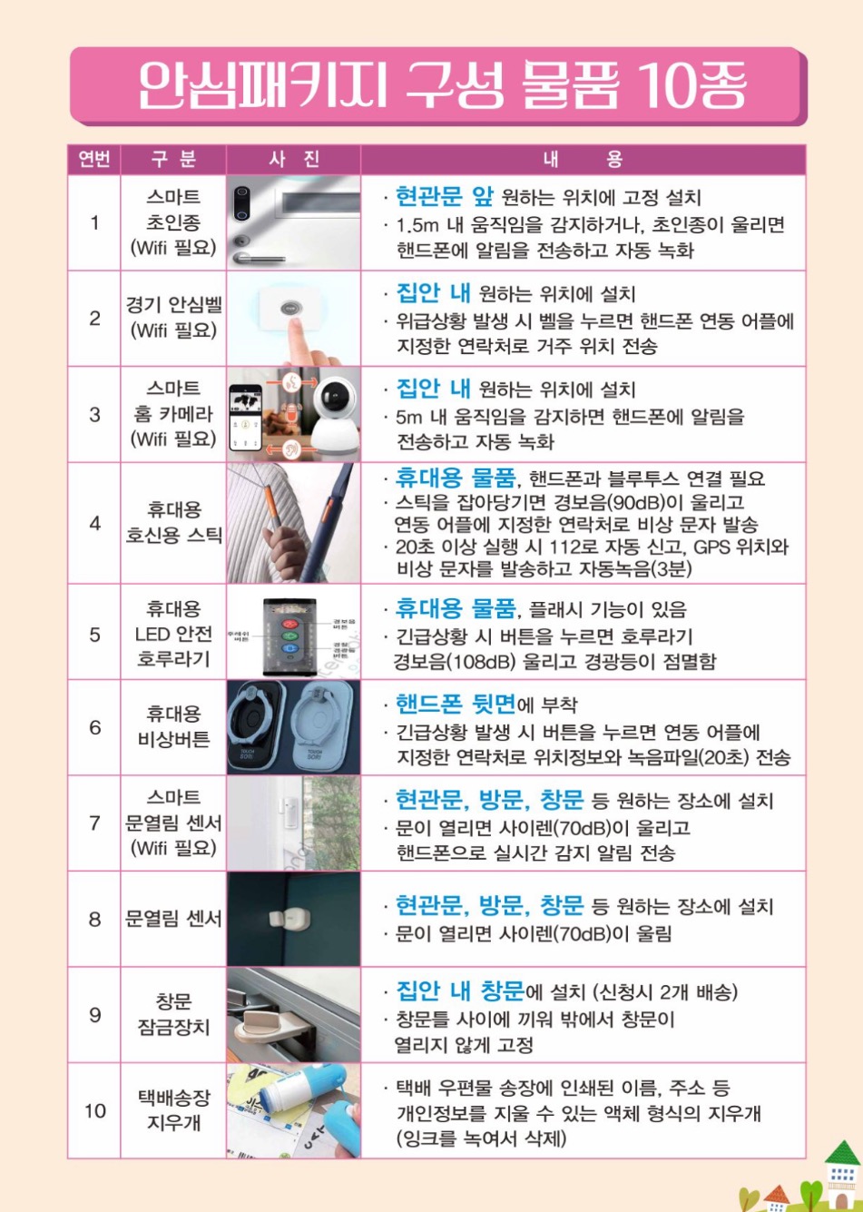 안심패키지 신청대상은 관내 주민등록을 둔 여성 1인 가구 세대주 중 전·월세 거주자이며 안심패키지는 신청자가 범죄 예방 물품 10종 중 5종을 선택해 구성할 수 있습니다.