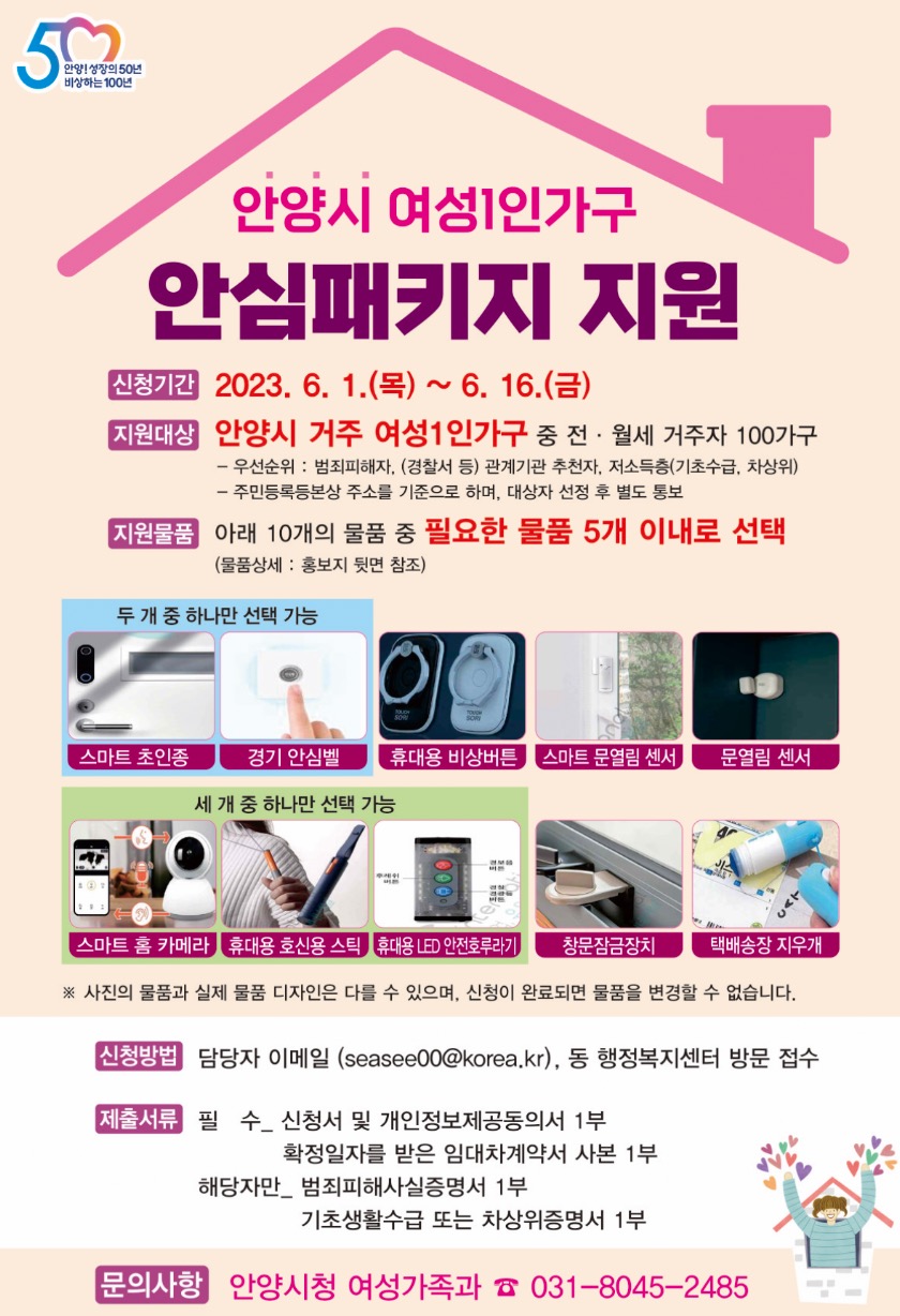 안양시가 ‘여성 1인 가구 안심패키지 지원사업(이하 안심패키지 지원사업)’을 추진하고 오는 2023년 6월 16일까지 신청자를 모집한다고 2일 밝혔습니다.