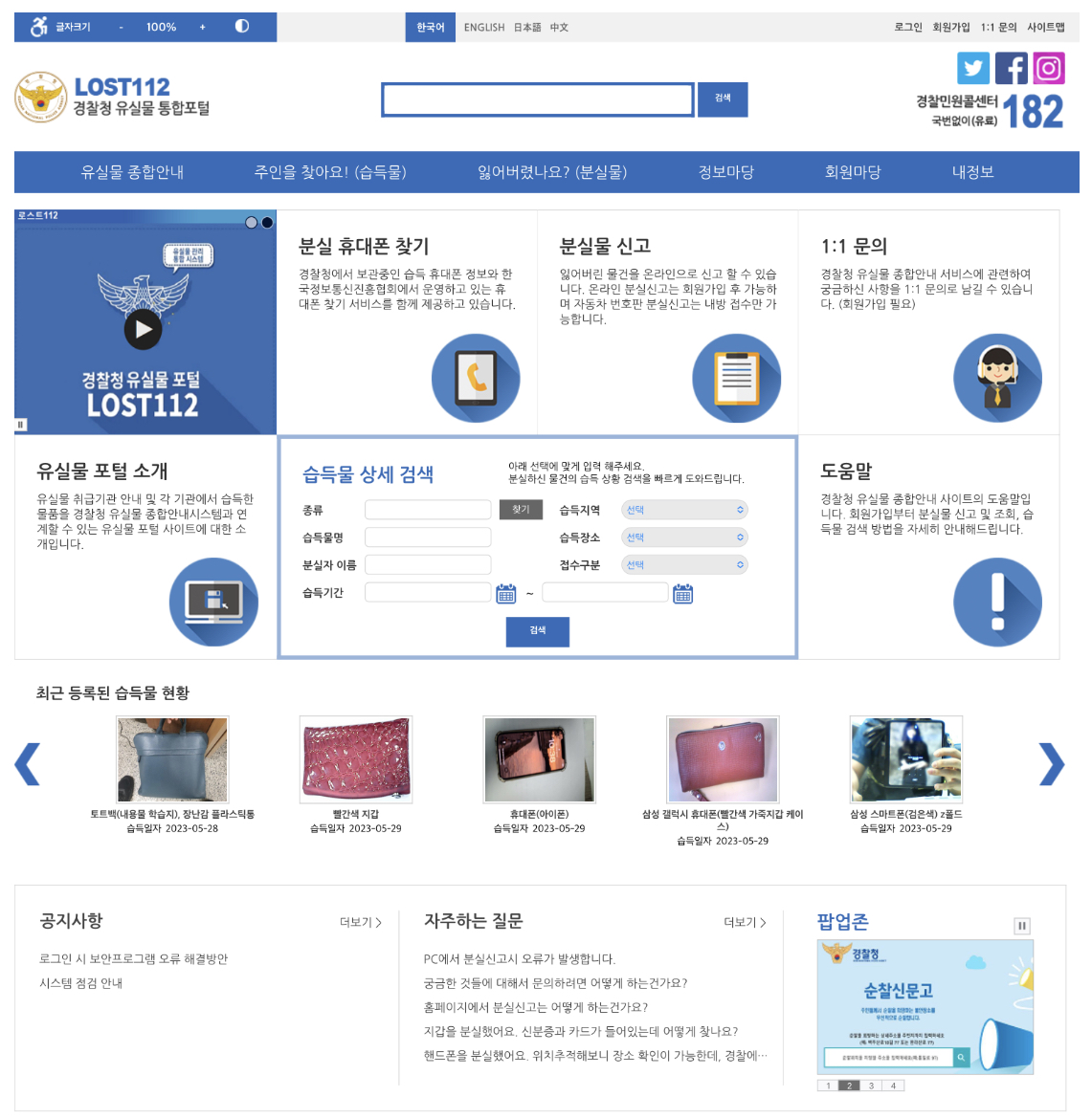 lost112이라는 경찰청 유실물 통합포털을 통해서 습득물 종류와 시간, 습득 지역, 장소 등을 상세하게 조회할 수 있는데 주인을 기다리는 습득물 현황이 실시간으로 업로드되어 분실 장소, 시간, 날짜를 알지 못해도 내가 잃어버린 물건이 접수되었는지 확인할 수 있습니다.
