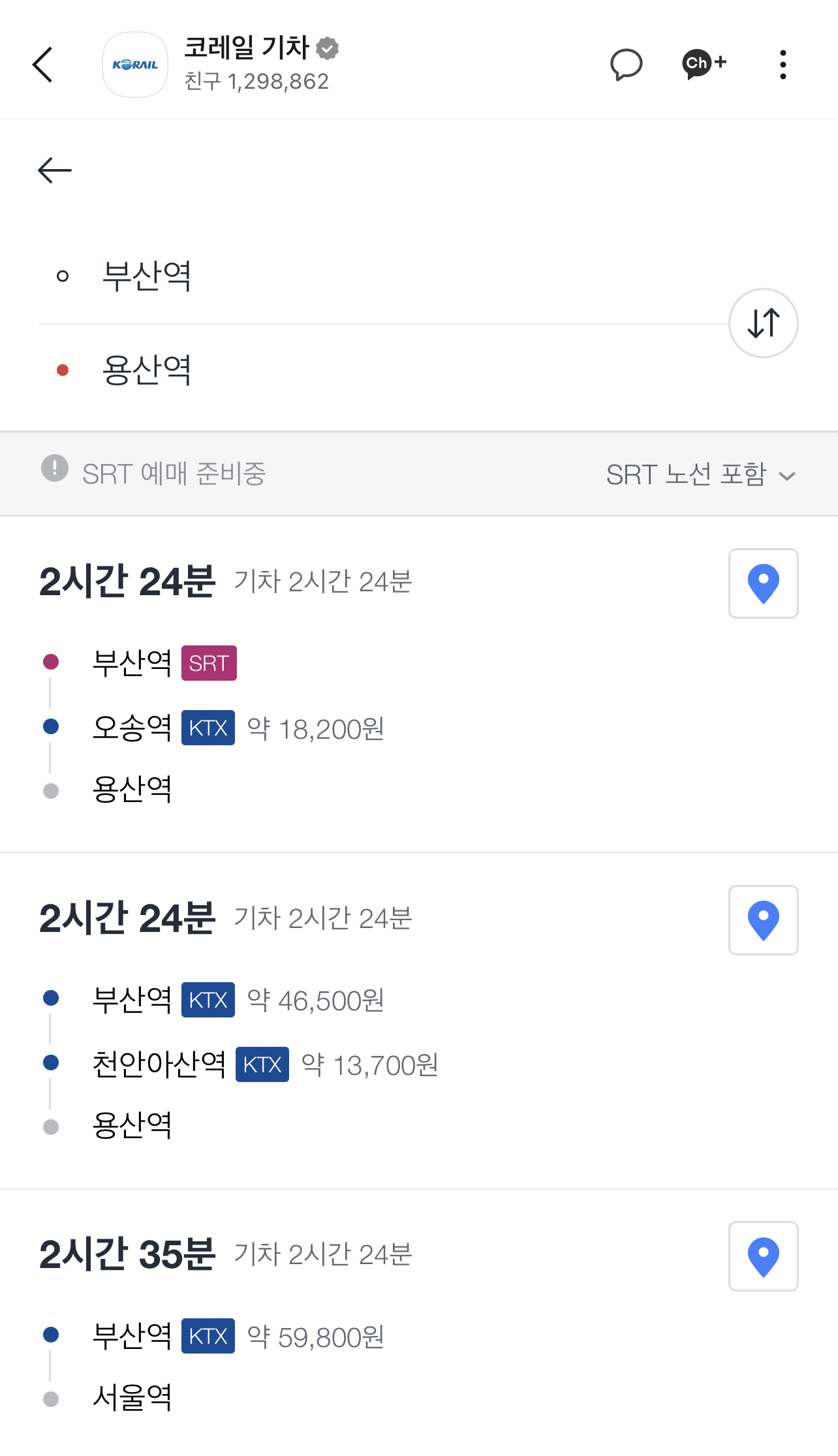 5. 그러면 KTX 및 SRT 및 무궁화호, ITX, 새마을호 까지 기차정보 내용이 나오게 됩니다.