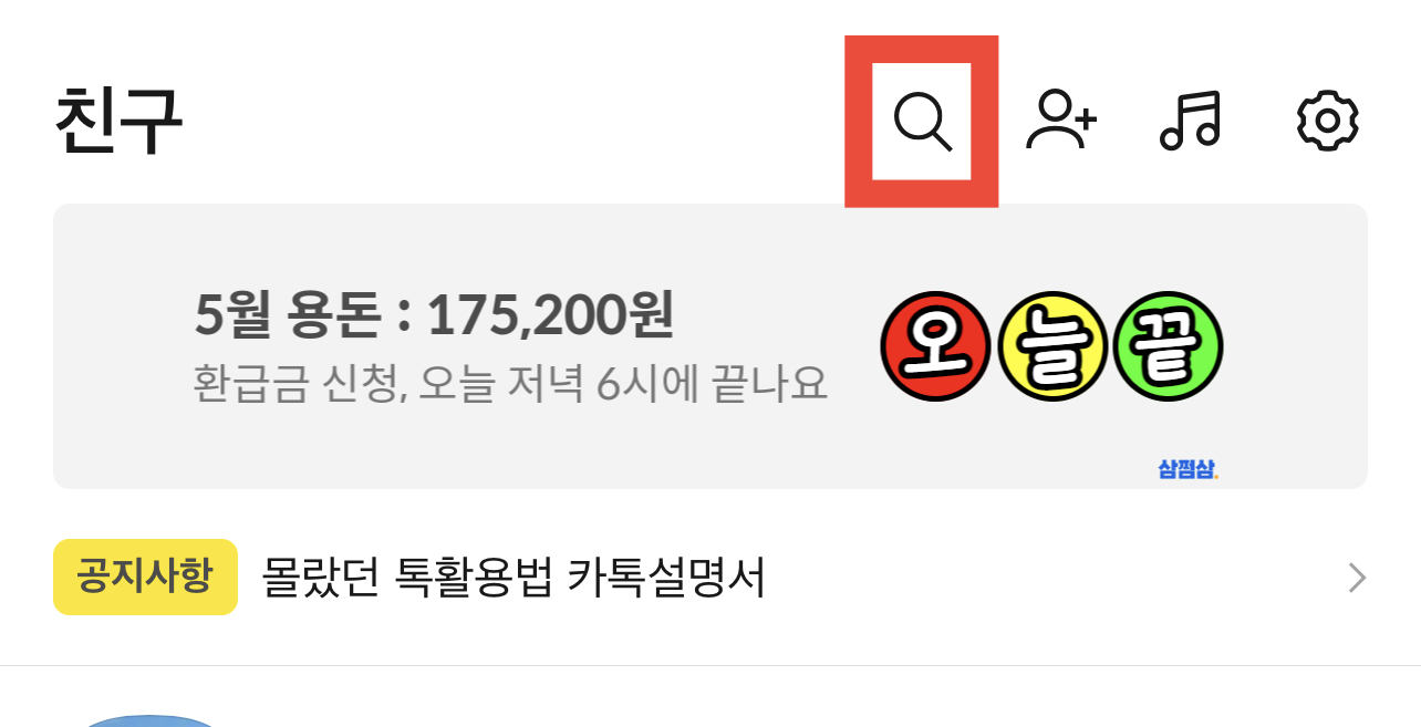 1. 일단 카카오톡을 실행 후 친구목록에서 상단 위 돋보기를 눌러주시길 바랍니다.
