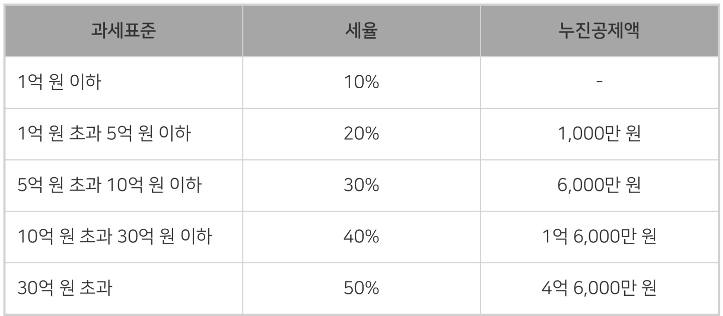 증여세 과세가액에서 증여재산공제를 빼고 과세표준에 세율을 곱해서 적용하는데 세율 표는 다음과 같습니다.