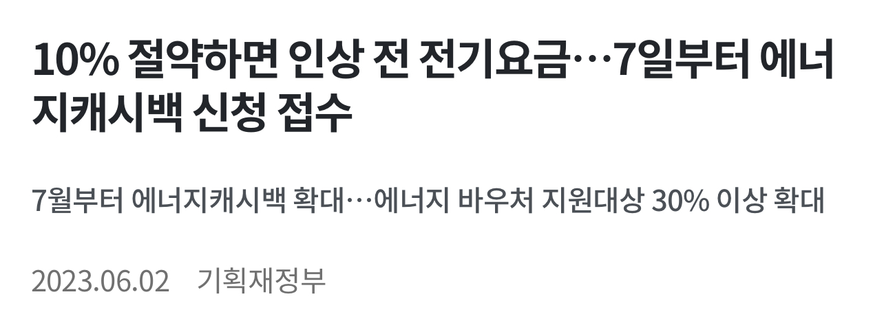 정부가 오는 2023년 6월 7일부터 전기사용량을 전년 동월 대비 10% 감축하면 현금 등으로 돌려받는 ‘에너지캐시백’ 접수에 들어간다고 밝혔습니다.