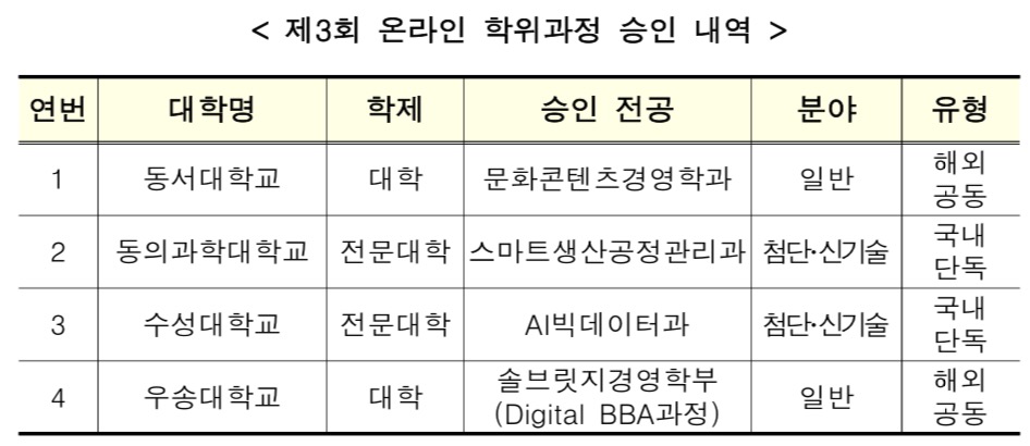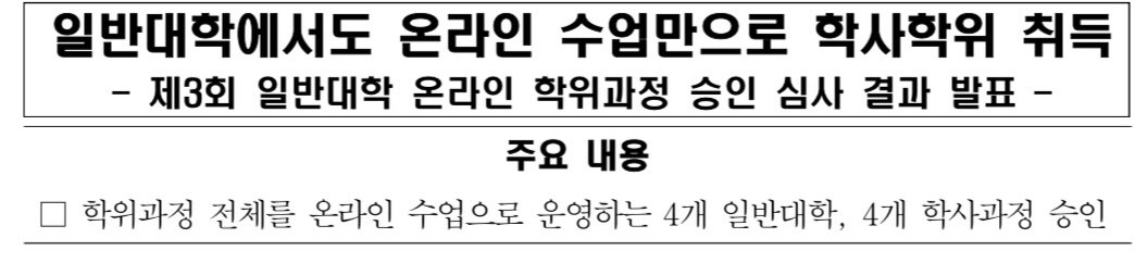 교육부는 ‘일반대학의 온라인 학위과정’ 심사 결과 4개 대학의 4개 (전문)학사과정이 승인되었다고 발표하였습니다.