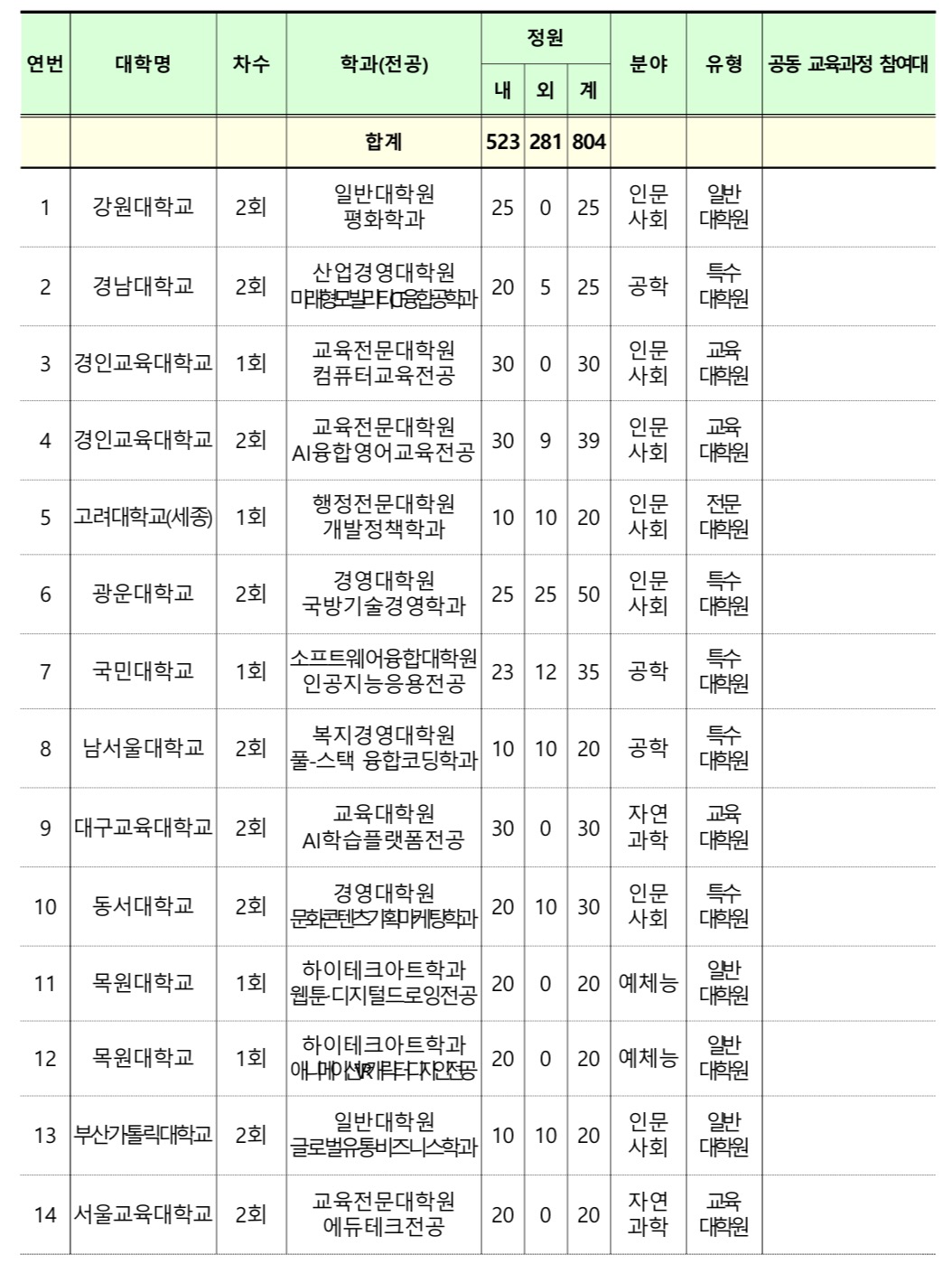 • (석사학위) 국내대학 단독, 국내대학 간 공동, 국내 외국 대학 공동 운영