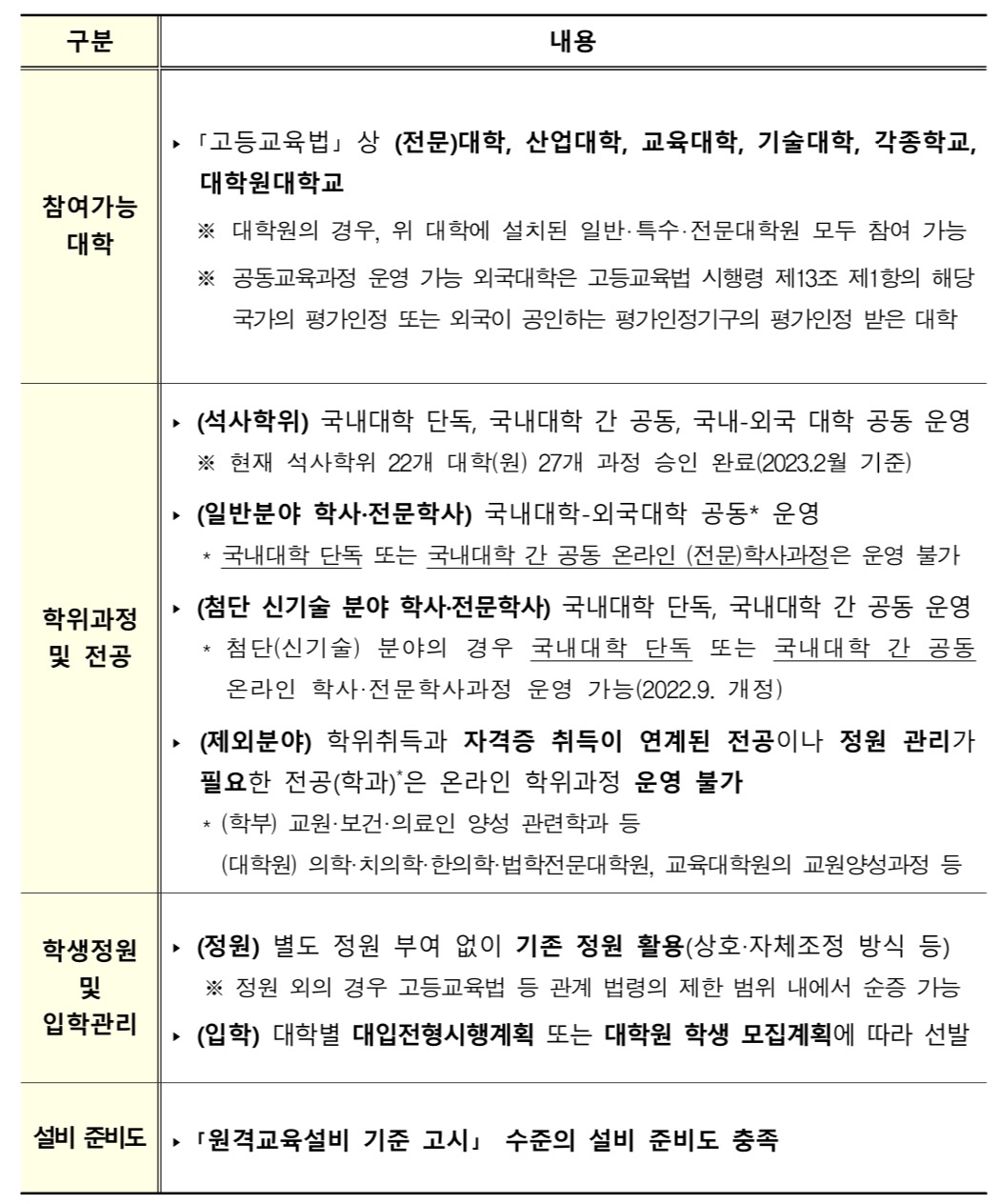 * 첨단(신기술) 분야의 경우 국내대학 단독 또는 국내대학 간 공동 온라인 학사•전문학사과정 운영 가능(2022.9. 개정)