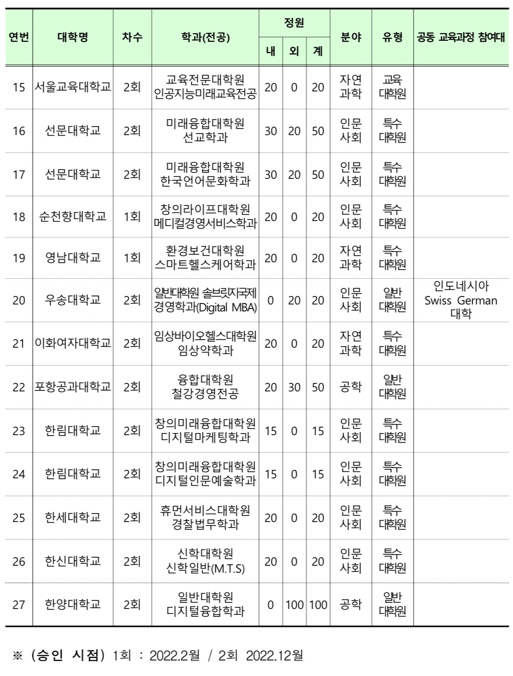 * (제1회 심사) 6개 대학원의 7개 전공 승인 / (제2회 심사) 17개 대학원의 20개 전공 승인