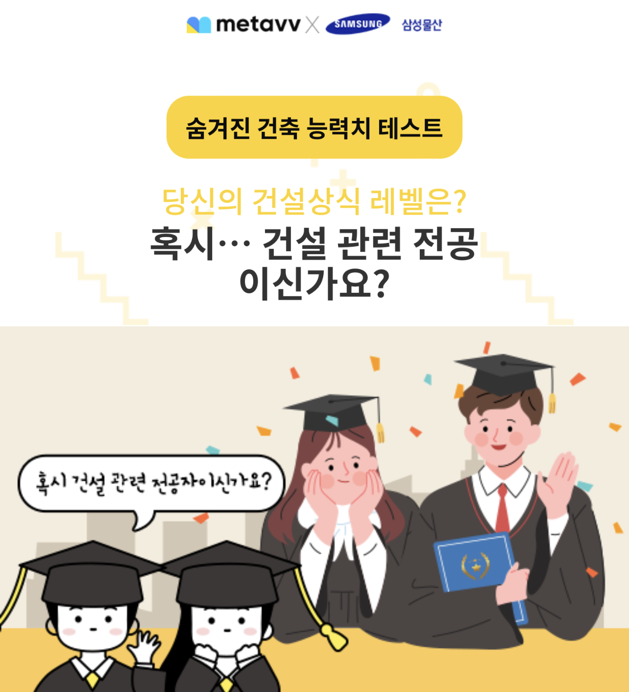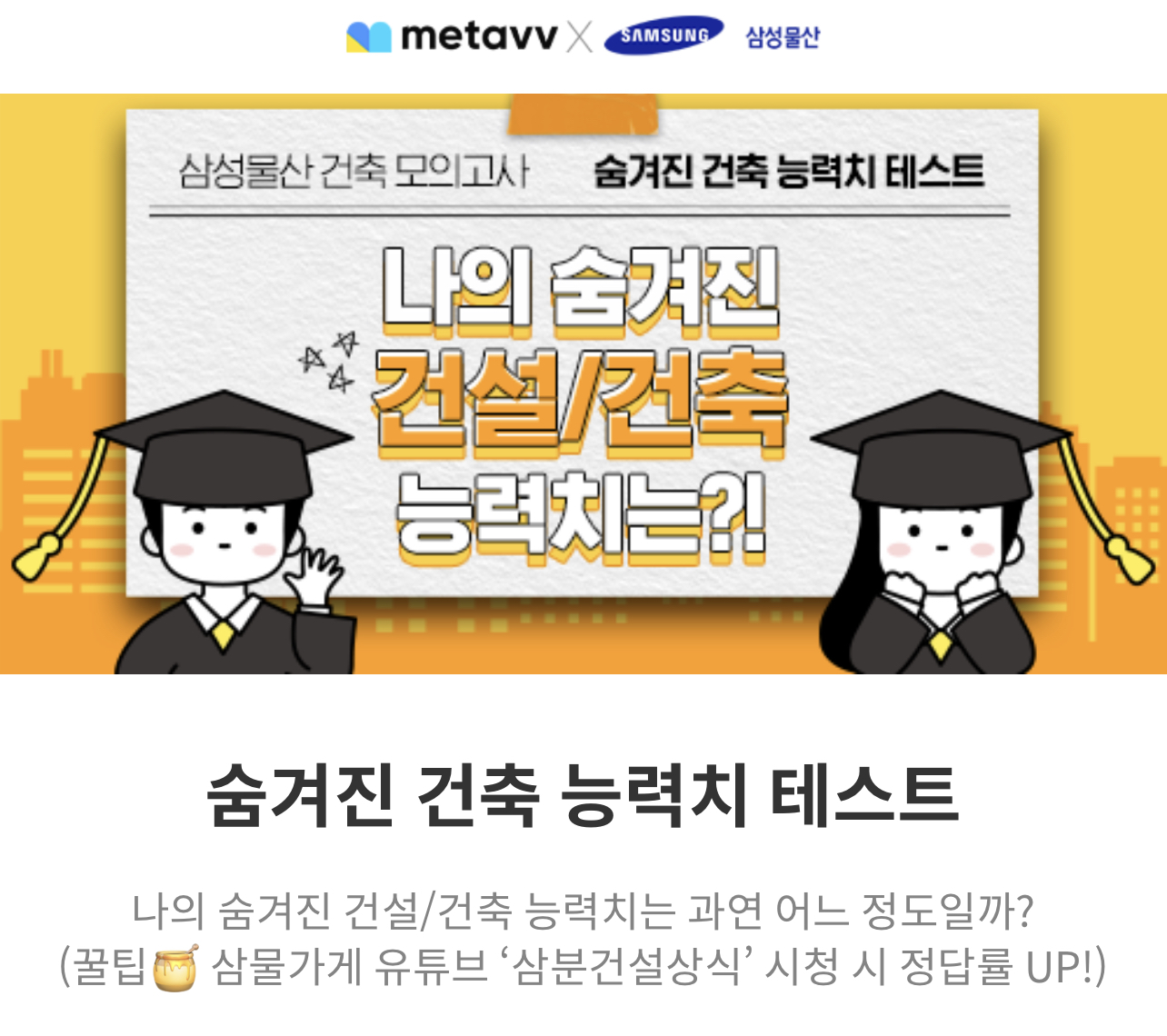 메타브와 삼성물산이 콜라보한듯한 나의 숨겨진 건설 건축 능력치는 과연 어느정도인지 알려주는 테스트가 있다고해서 여러분들께 소개드리려고 합니다.