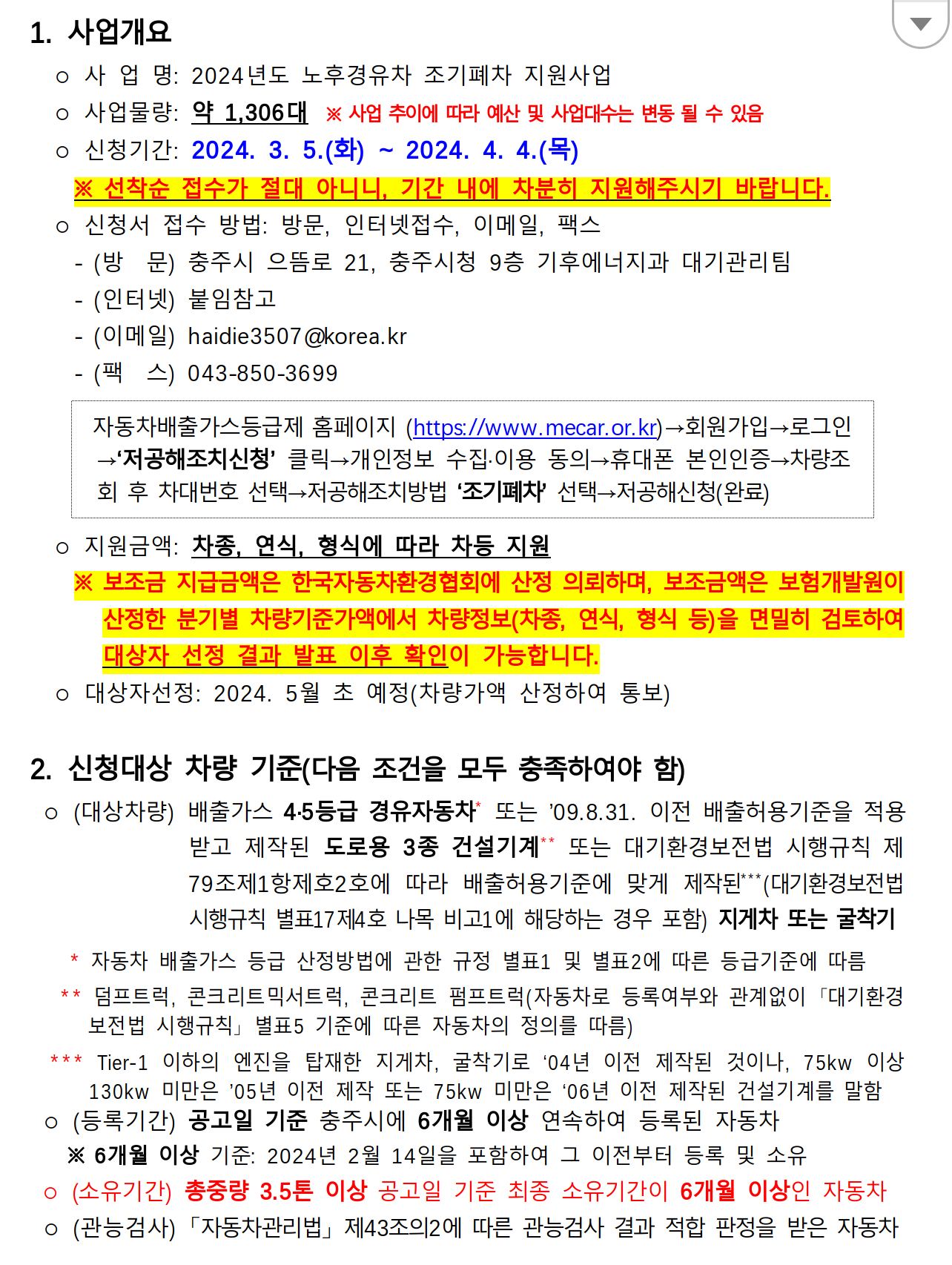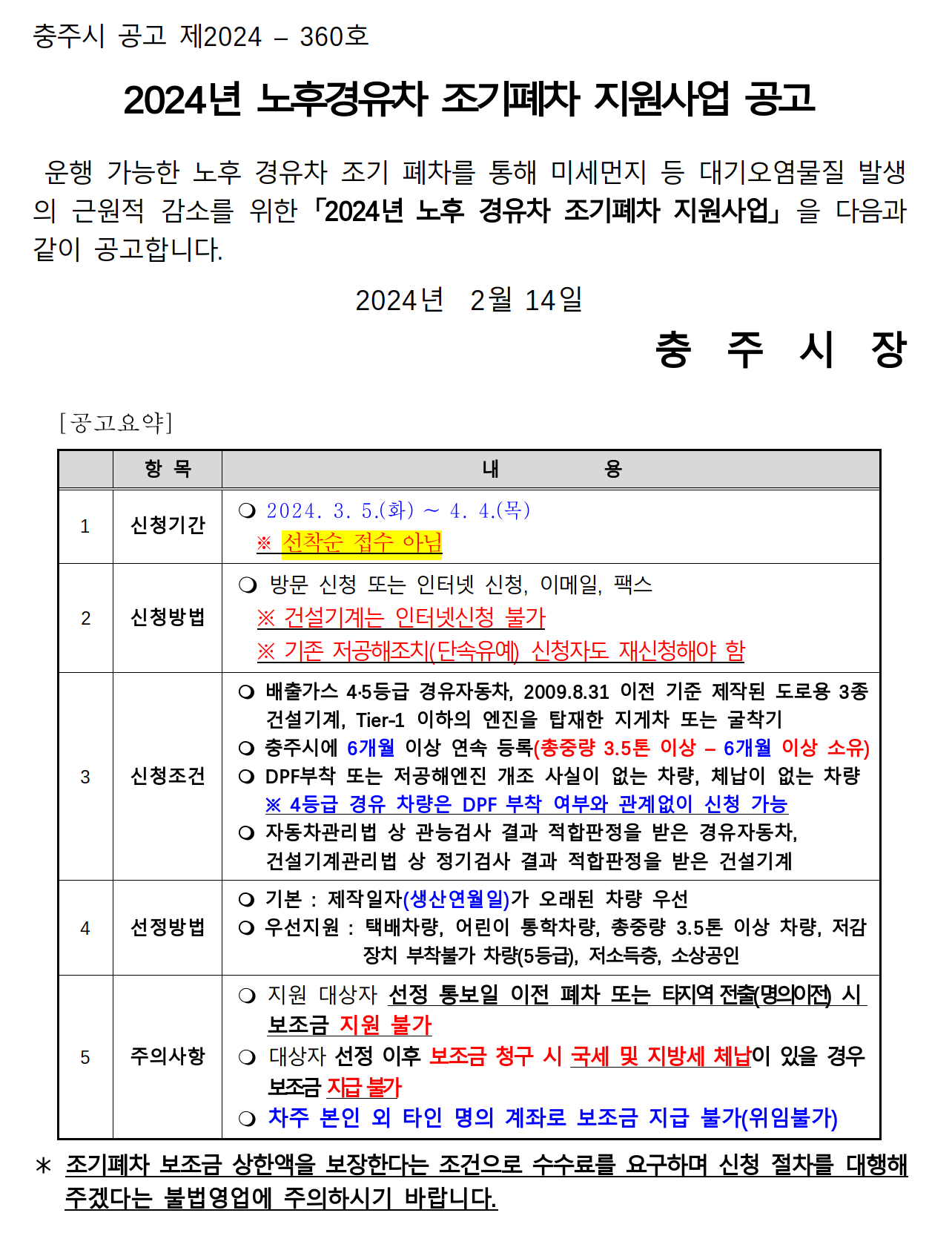 충북 충주시는 미세먼지 저감 및 대기질 개선을 위해 ‘2024년 노후경유차 조기폐차 보조금 지원사업’을 추진한다고 밝혔습니다.