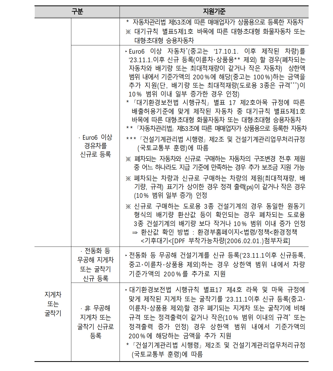 충주시 노후 경유차 조기 폐차 지원 대상은 공고일을 기준으로 충주시에 6개월 이상 연속 등록되어 있고 정상 운행이 가능한 배출가스 4·5등급 경유차, 도로용 3종 건설기계(덤프트럭, 콘크리트믹서트럭, 콘크리트펌프트럭) 및 지게차·굴착기입니다.