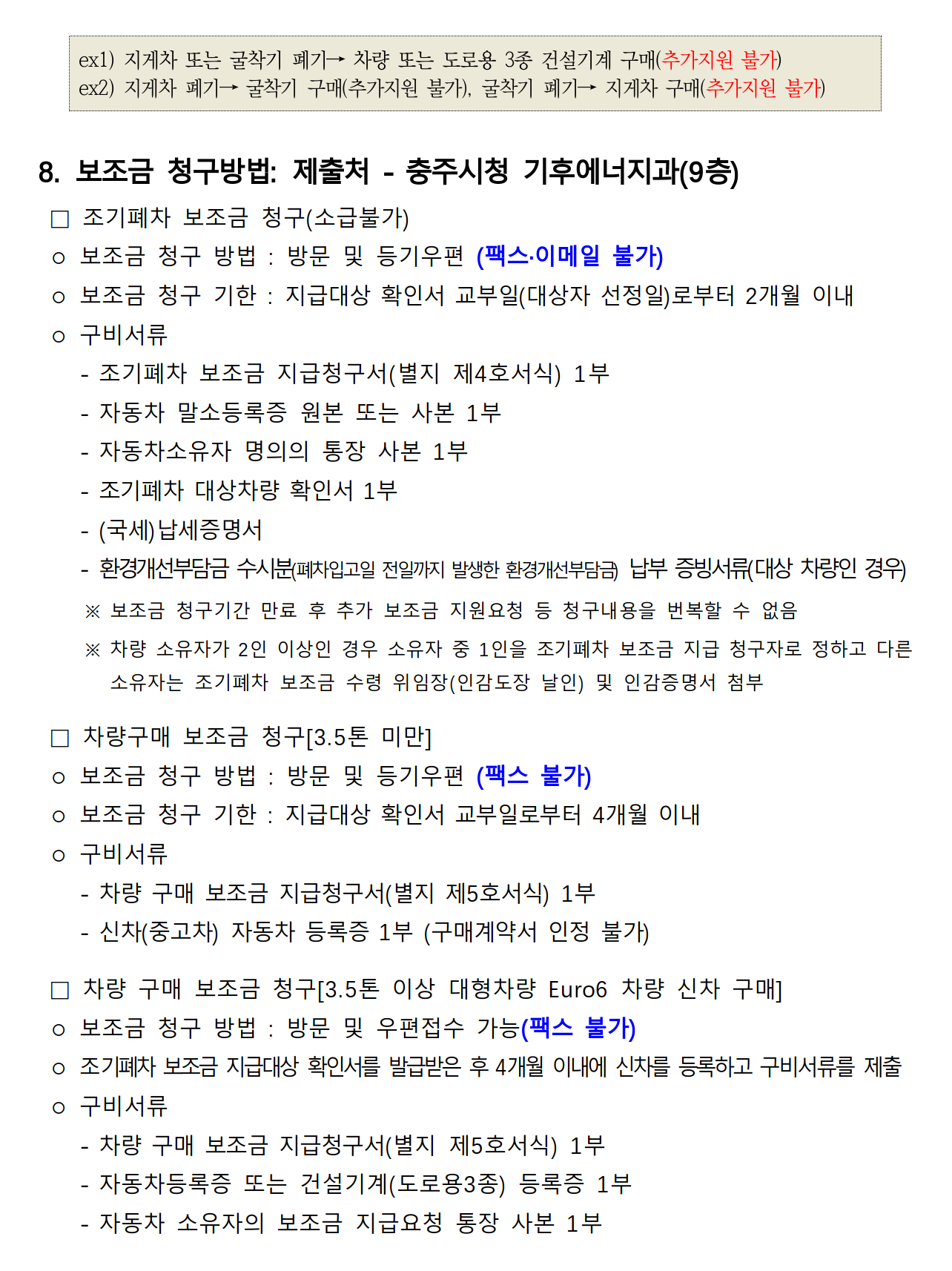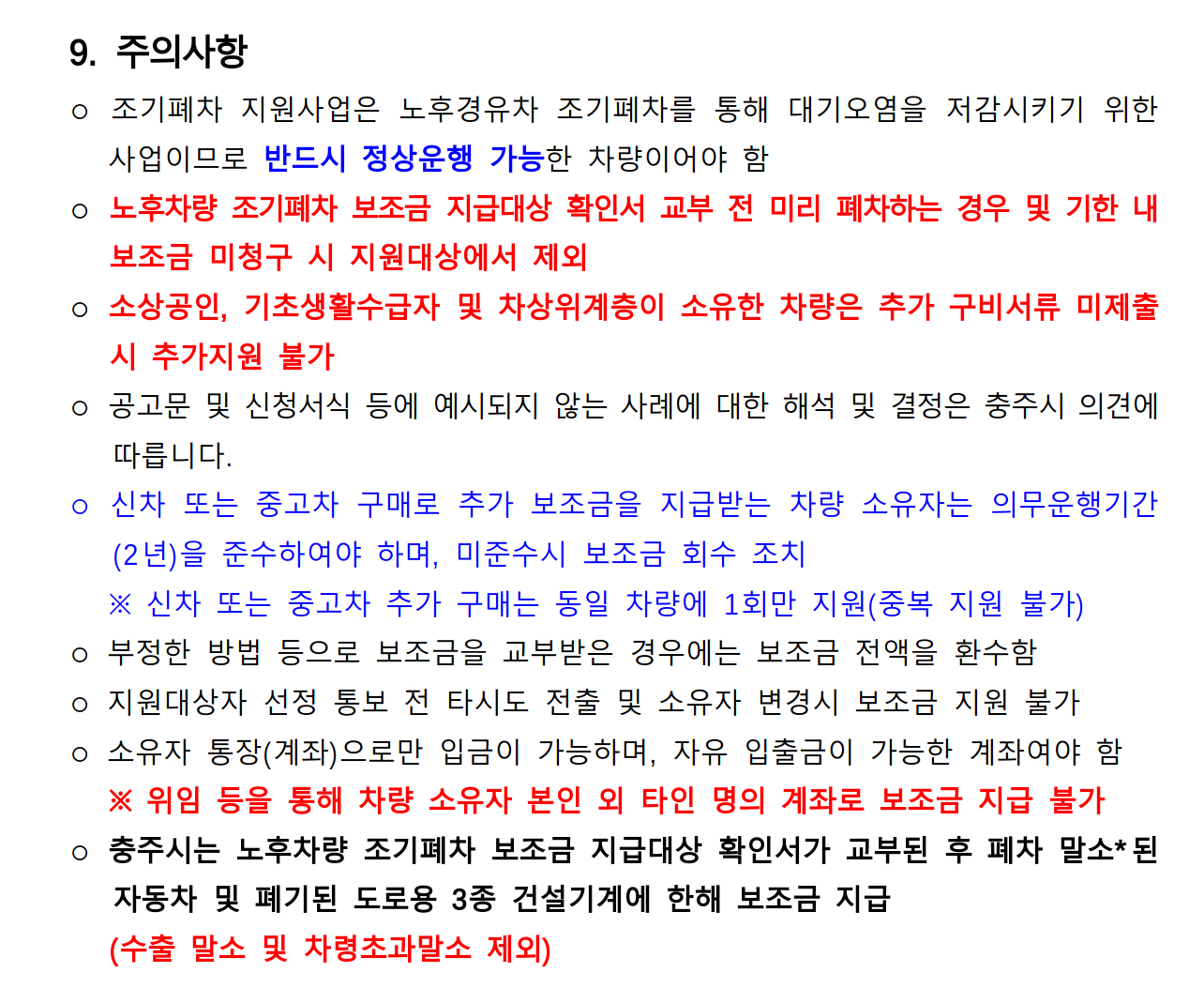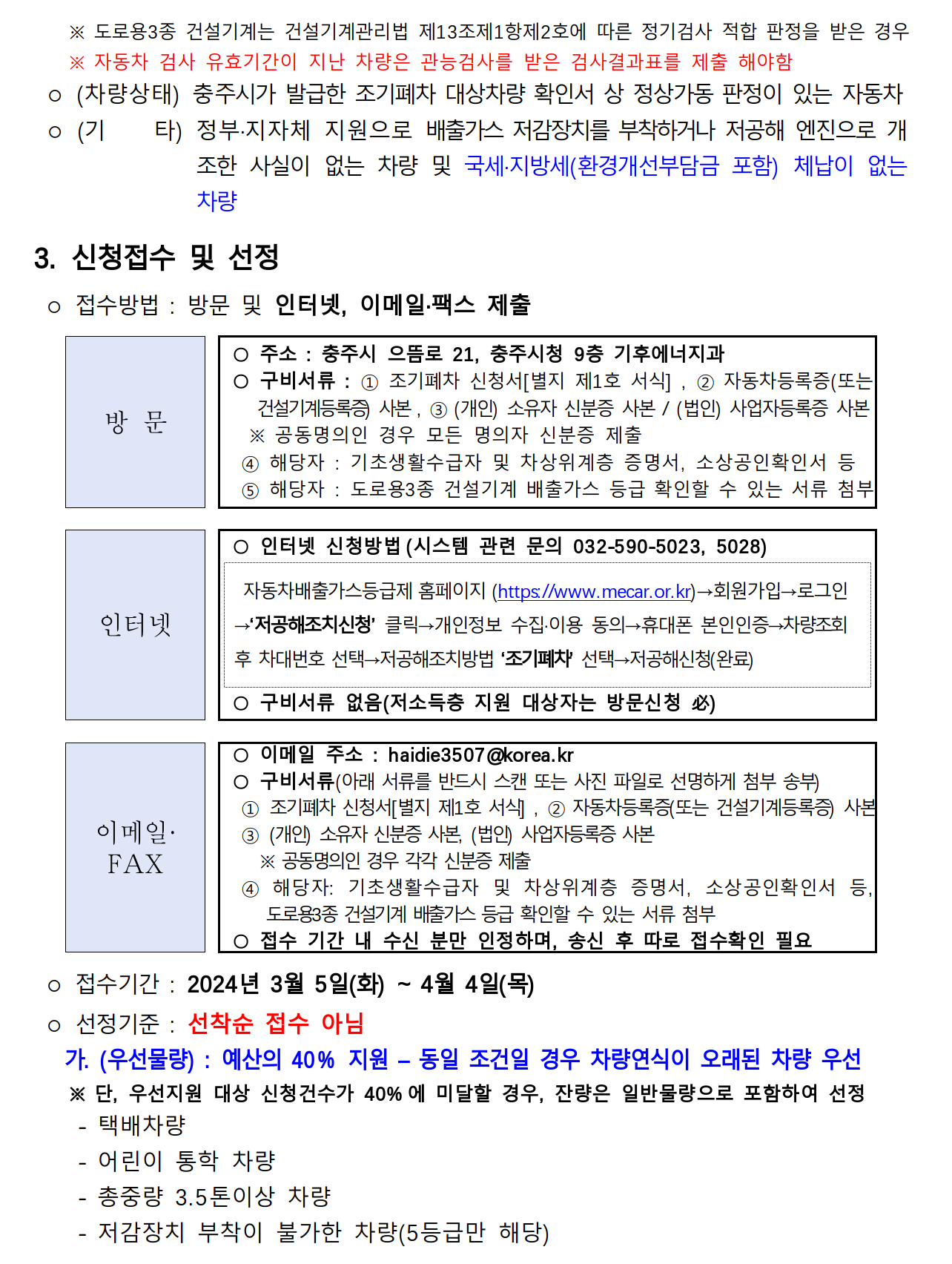 충주시 노후 경유차 조기 폐차 지원 신청 방법 등 기타 자세한 사항은 충주시청 홈페이지 고시공고란을 참고하거나 기후에너지과 대기관리팀으로 문의하면 됩니다.