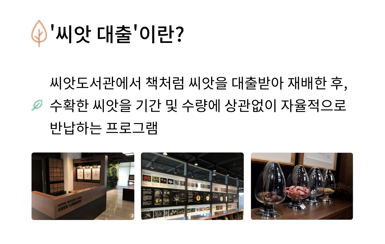 보다 자세한 내용은 서울식물원 씨앗도서관을 참고해 보시면 이용안내, 이달의 씨앗, 씨앗 정보 등 다양한 정보를 얻을 수 있으니 확인해 보시길 바랍니다.