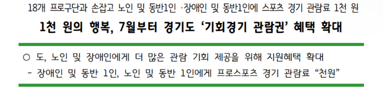 경기도는 하반기부터 노인과 장애인에게 프로경기 관람료를 할인해주는 ‘기회경기 관람권’ 할인 혜택을 기존 75% 지원에서 본인 부담 1천 원으로 혜택을 확대한다고 밝혔으며 이에 따라 도내 만 70세 이상 노인과 동반 1인, 등록 장애인과 동반 1인은 경기도 연고 18개 프로스포츠 구단의 홈경기 관람 시 각각 1천 원으로 입장권을 구매할 수 있습니다.