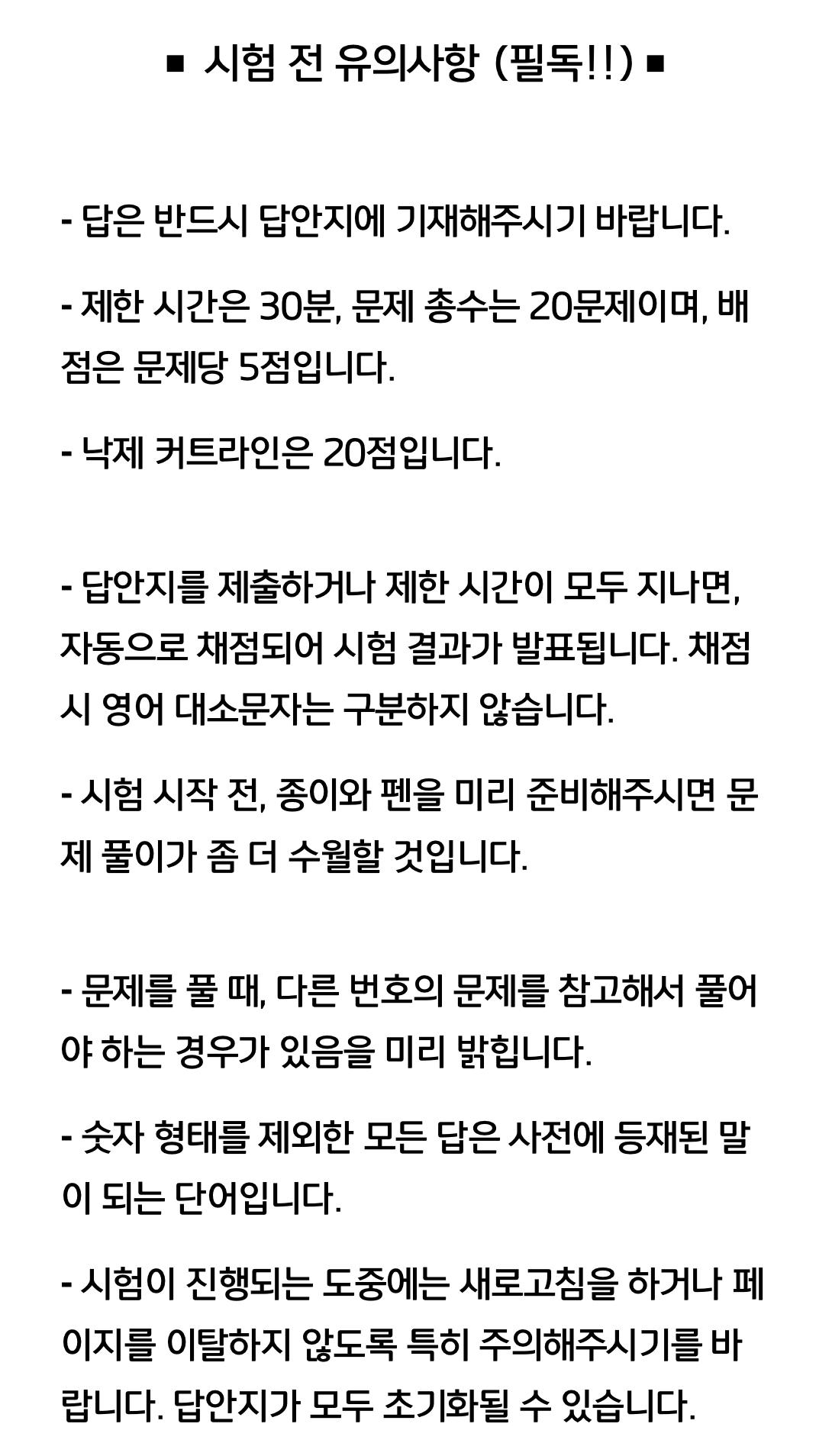 처음시작하면 시험 전 유의사항이 나오는데 꼭 잘 읽어보시고 푸시길 바랍니다.