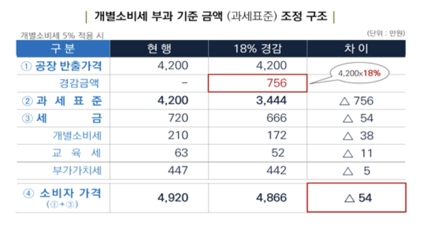 예를 들어 제조장 반출가격이 4200만원인 그랜저는 2023년 7월부터는 과세표준이 4200만원에서 18% 낮아진 3444만원이 됩니다.