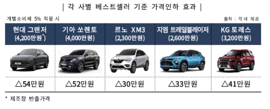 이번 조치로 현대차 그랜저의 소비자가격은 기존 4920만원(제조장 반출가격 4200만원 + 세금 720만원)에서 4866만원으로 54만원 싸진다. 기아 쏘렌토는 52만원, 르노 XM3 30만원, GM 트레일블레이저 32만원, KG토레스 41만원 등의 가격 인하 효과가 예상된다고 합니다.