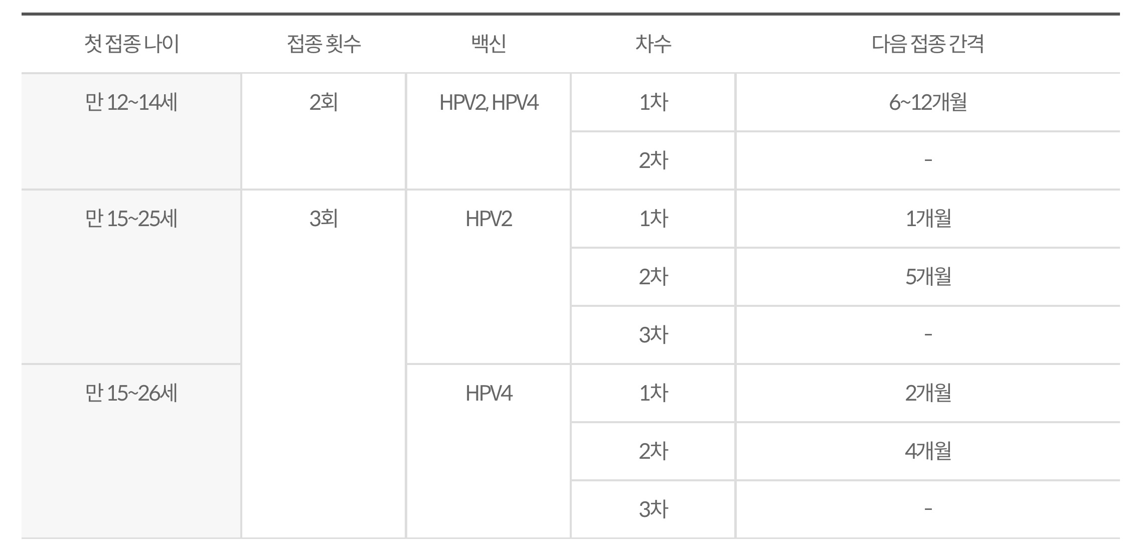 첫 접종 나이 및 접종 내역에 따라 접종 횟수 상이