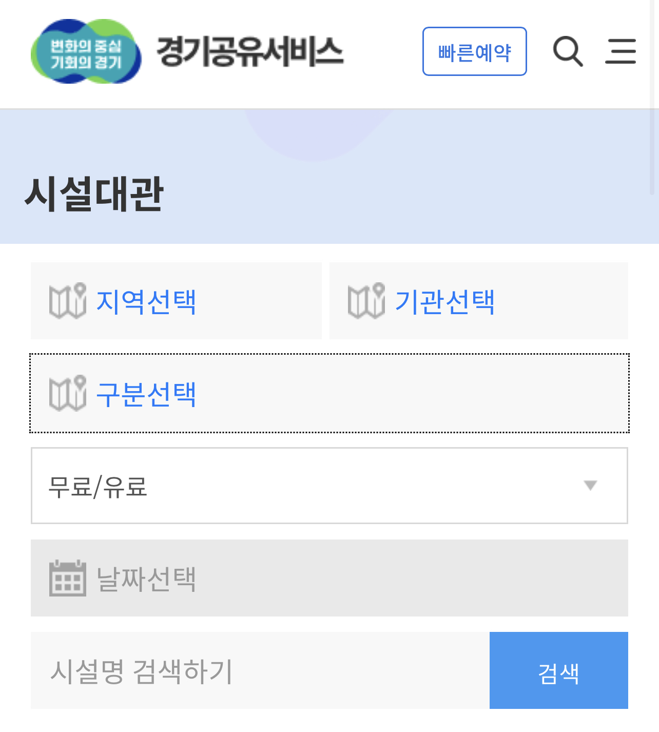2. 시설대관에서 지역선택(가평군, 과천시, 광주시, 군포시, 남양주시, 부천시, 수원시, 안산시, 안양시, 양평군, 연천군, 용인시, 의정부시, 인천시, 평택시, 하남시, 고양시, 광명시, 구리시, 김포시, 동두천시, 성남시, 시흥시, 안성시, 양주시, 여주시, 오산시, 의왕시, 이천시, 파주시, 포천시, 화성시) 후 기관선택과 구분선택에서 “회의실”을 체크 후 무료나 유료를 요금 관련을 체크해서 날짜를 지정한 후 검색하시길 바랍니다.