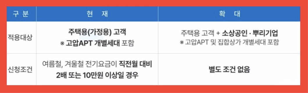 기존에는 일부 주택용 고객만 신청 가능했지만 주거용 주택용 고객을 포함한 소상공인 및 뿌리기업 고객(일반용·산업용·비주거용주택용)까지 신청 가능대상을 확대했다고 합니다.