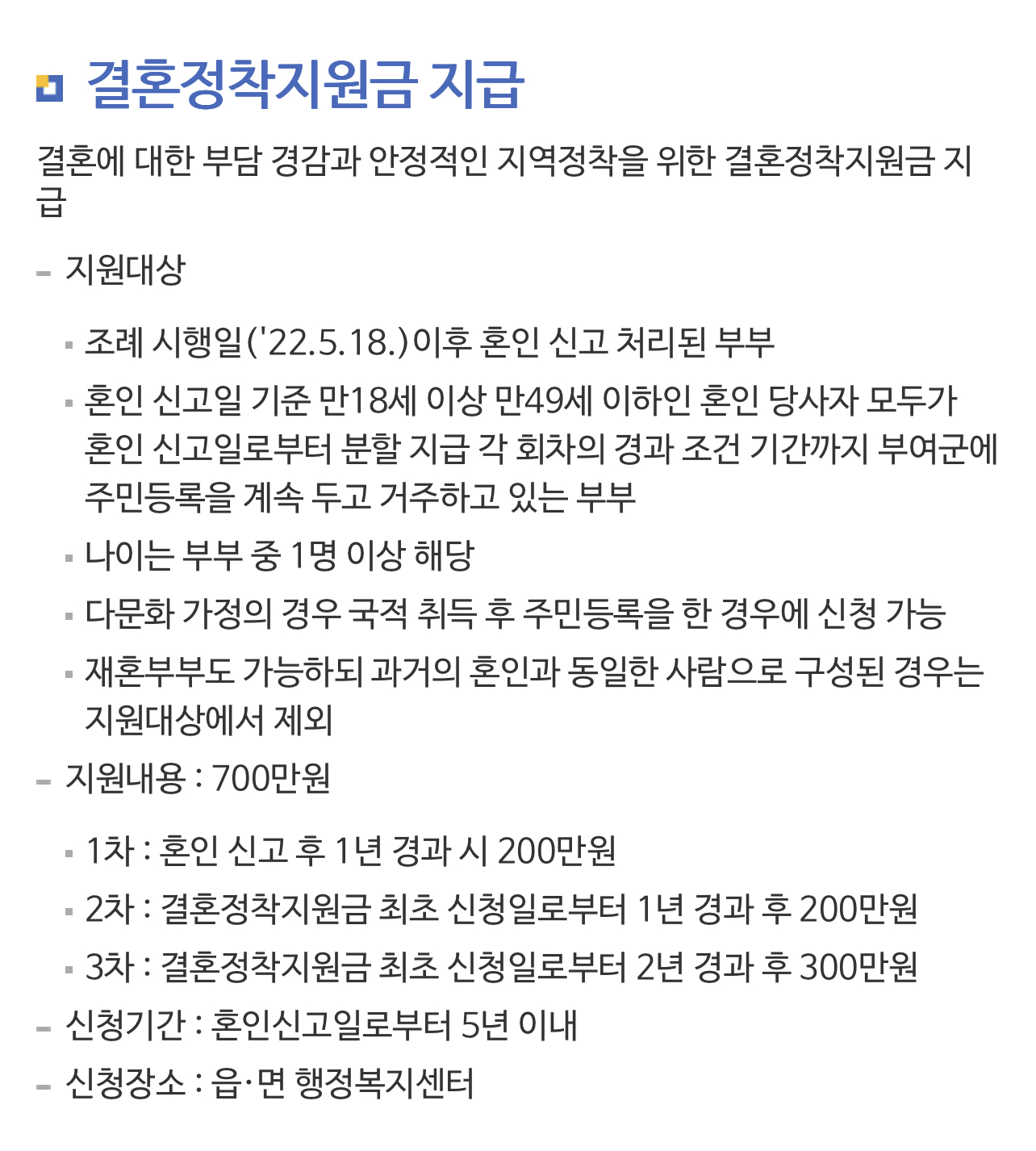 • 혼인 신고일 기준 만 18세 이상 만 49세 이하인 혼인 당사자 모두가 혼인 신고일로부터 분할 지급 각 회차의 경과 조건 기간까지 부여군에 주민등록을 계속 두고 거주하고 있는 부부