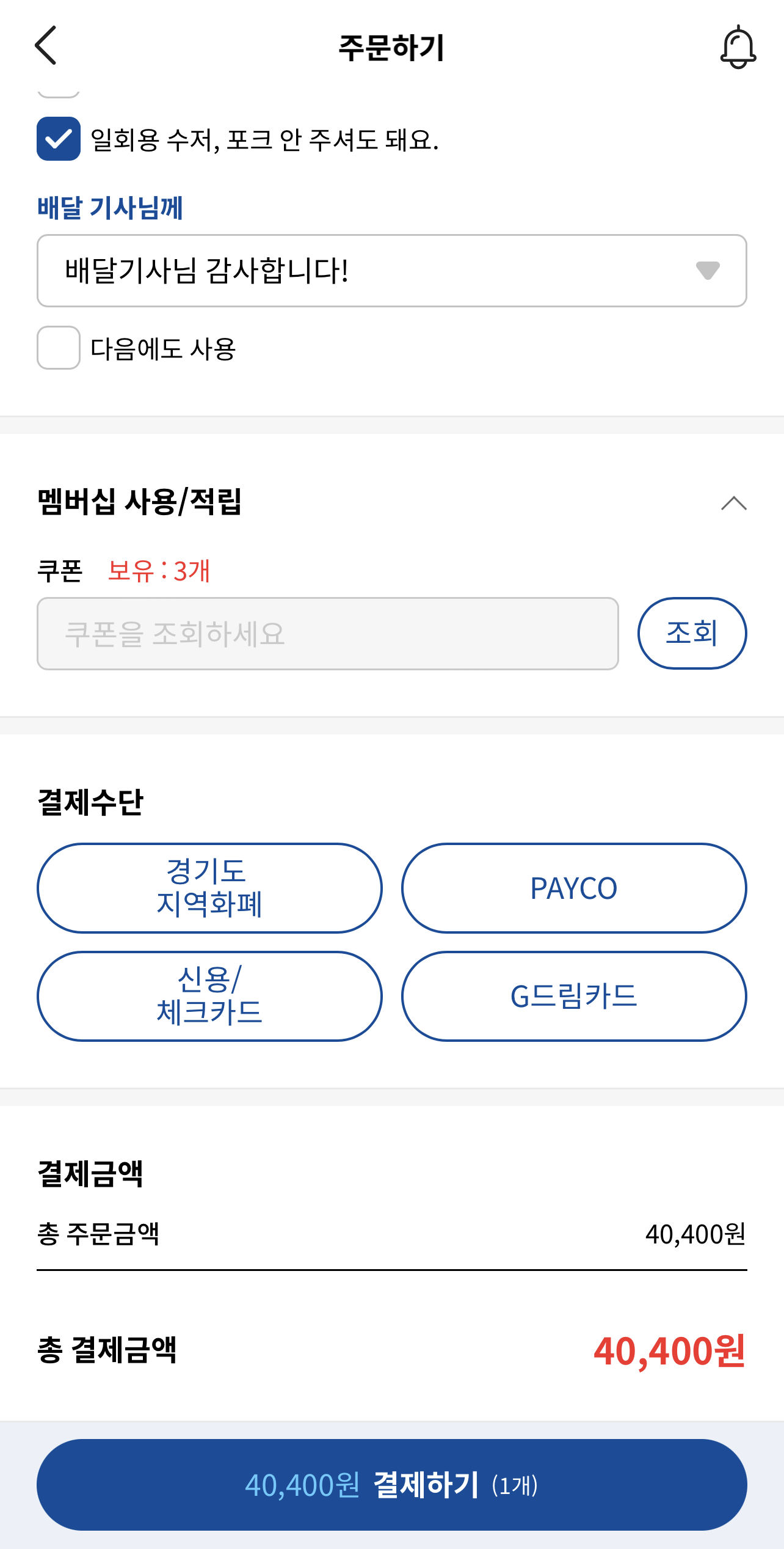 2. 결제수단에 보시면 “지역화폐”가 있는데 이를 클릭해서 지역화폐로 결제가 가능하며 참고로 멤버십 사용/적립 및 쿠폰 사용을 통해서 할인되는게 있다면 할인도 같이 받으시길 바랍니다.
