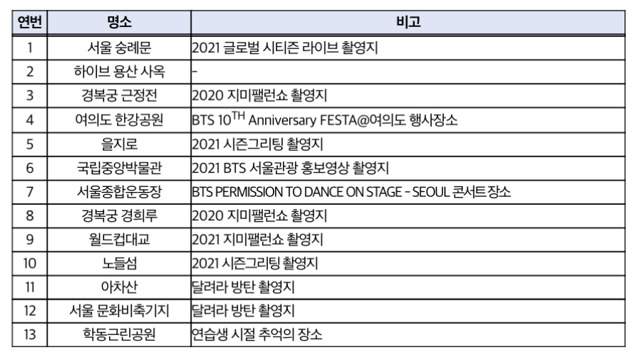 BTS 관련 서울의 주요 관광명소 정보는 비짓서울을 통해 서울을 방문할 팬뿐만 아니라 전 세계 관광객들에게 서울을 홍보할 예정이라고 합니다.