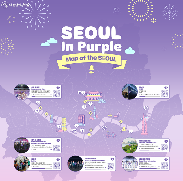 ‘서울방탄투어’ 지도에 포함된 명소는 BTS 멤버들이 연습생 시절 자주 찾던 장소, 자체 제작 콘텐츠인 ‘달려라 방탄’의 주요 촬영지 등으로 서울의 명소들을 엄선했다고 합니다.