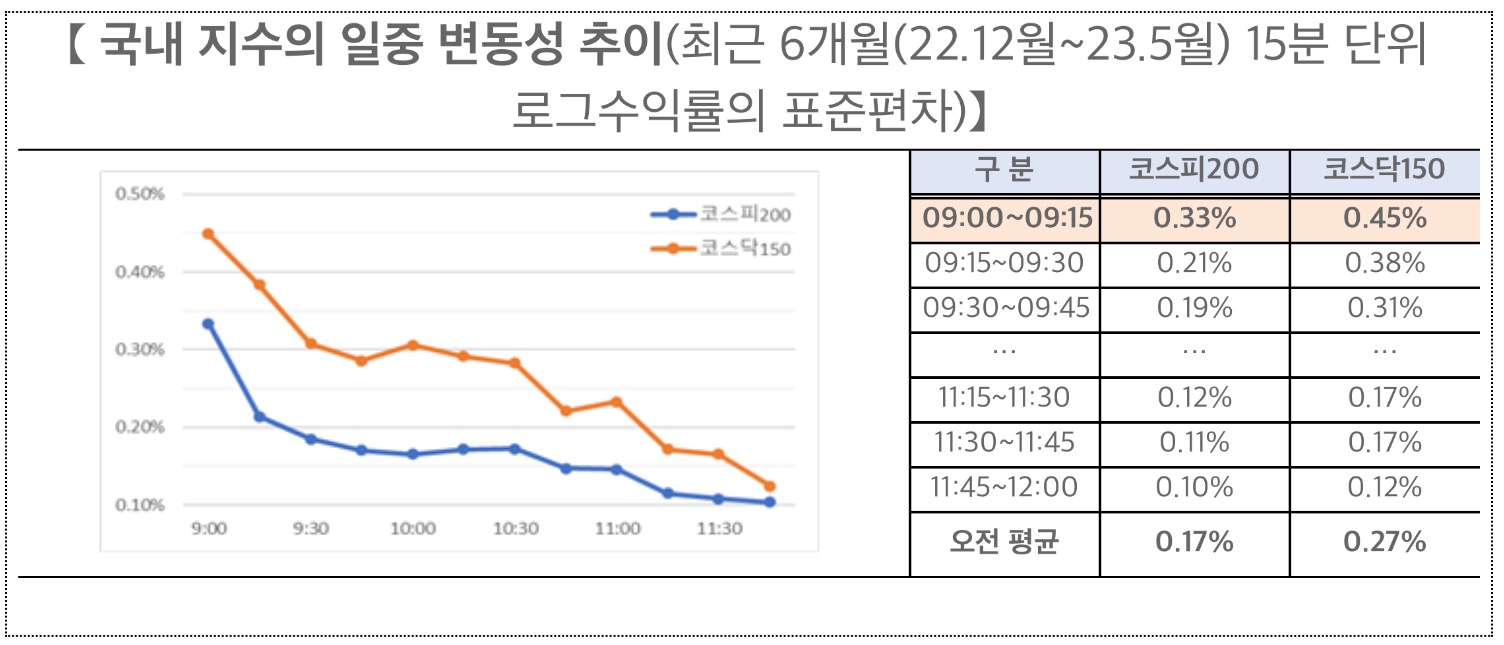 또한, 현물시장과 선물시장이 동시에 개장하면서 개장 전에 발생한 주요 변동사항이 선물시장에서 미리 조정되지 못하고 주식시장에서 바로 가격발견이 이루어지는 과정에서 일중 주식시장 가격변동성 대비 주식시장 개장 초기 15분간의 변동성이 높게 나타났다고 합니다.