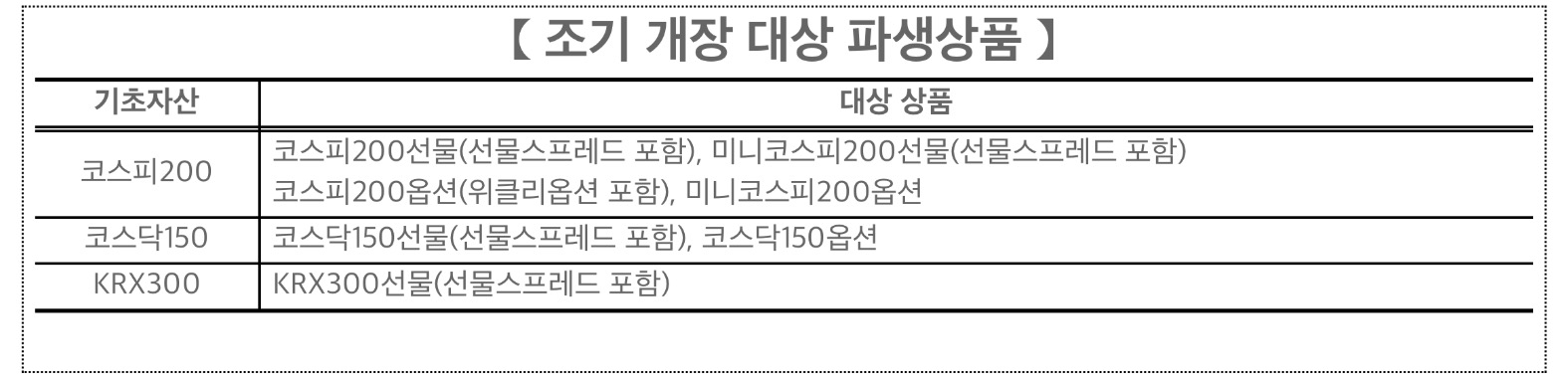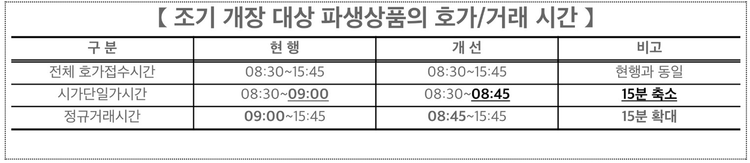 * 파생상품시장의 전체 호가접수시간은 현행과 동일(08:30~15:45)하며, 조기개장 대상상품과 관련된 협의대량거래 신청 및 착오거래 정정신청 등은 8:45분부터 가능