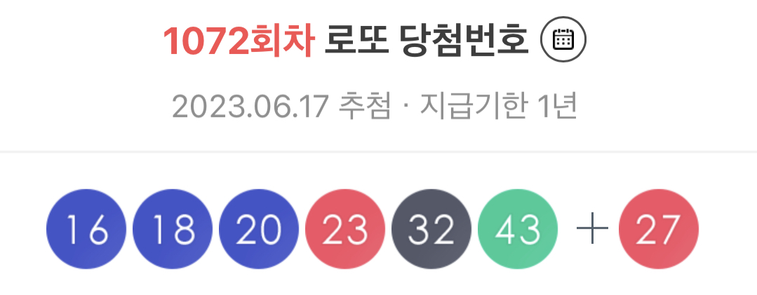 로또 당첨번호 조회 결과 16,18,20,23,32,43번