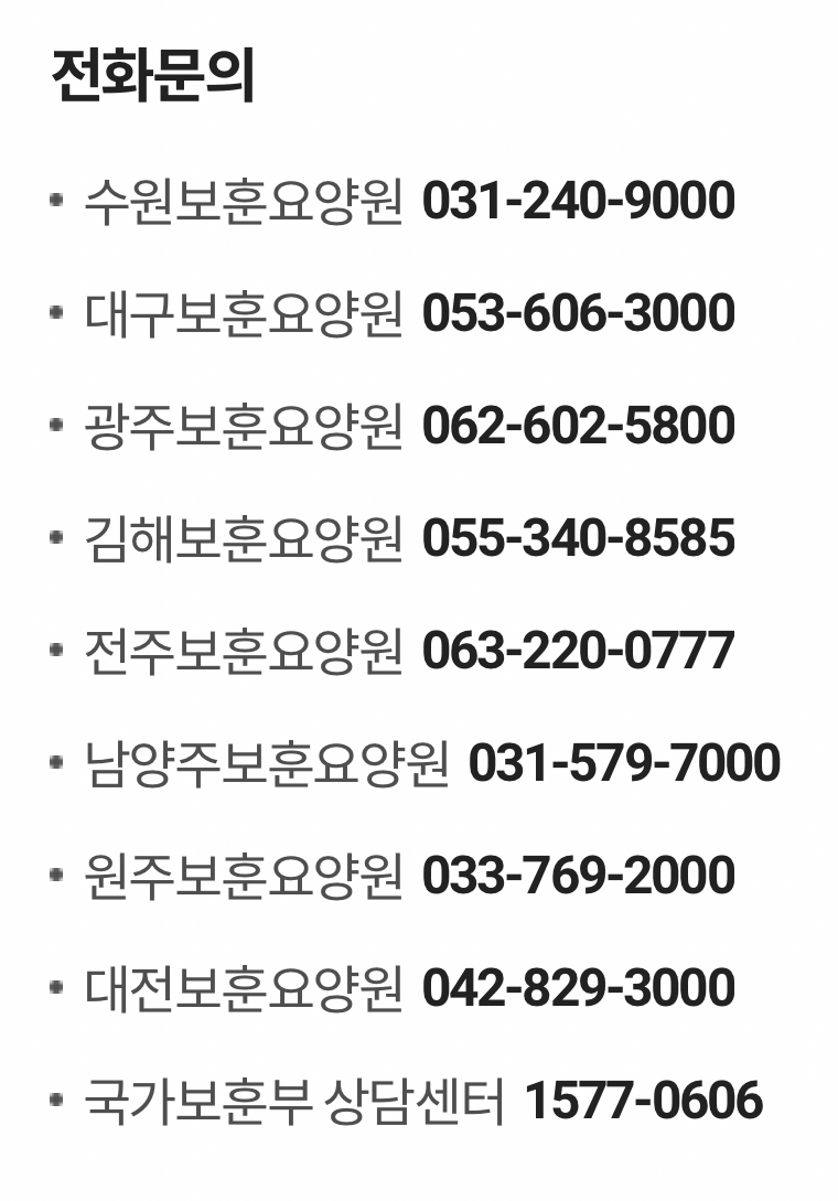 보다 자세한 문의는 전화 문의 또는 각 지역 보훈요양원 홈페이지를 참고하시길 바랍니다.